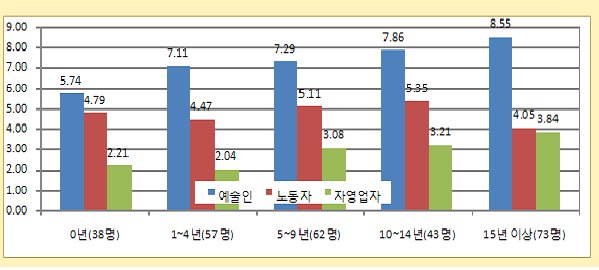 한편, 이와 같은 인식과 높은 상관성을 보이는 것은 공연예술분야의 총경력이라 할 수 있는데,3) (그림6)을 보면, 예술인이라는 인식은 자신의 총경력과 비례관계를 보이고 있음을 알 수 있다. 자영업자라는 인식도 이와 비슷한 양상을 보이나 노동자라는 인식에서는 그렇지 않았다.