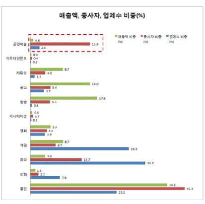 아무튼 실태조사결과 한국의 공연산업은 타 문화산업에 비해 매출액 기준 노동집약도가 높고 노동생산성이 낮은 노동집약형 산업이라는 사실이 수치상으로도 확인되었다.