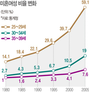 골드미스가 어느 정도 되는지에 대한 정확한 통계치는 없지만, 2000~2005년 사이 25~29세 여성 미혼율은 39.7%에서 59.1%로 높아졌다. 예전 같으면 왕성한 출산이 가능한 나이라고 할 수 있는 30~34세 여성의 미혼율도 10.5%에서 19%로 늘었고, 같은 기간 35~39세 여성의 미혼율도 4.1%에서 7.6%로 증가했다.