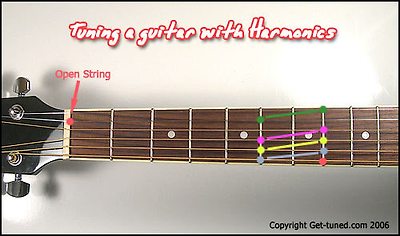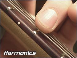 하모닉스란 배음이라 표기합니다. 일정 진동을 가진 현악기에서 실제로는 잘 들을수 없는 진동을 인위적으로 시뮬레이션 하는 소리라고 하는것이 비슷한 표현이 될것 같습니다. 실제로 기타줄을 누르지 않고 손가락만 살짝 걸친 상태에서 기타줄을 퉁기는 거죠. 너무 세게 대면 진동이 울리지 않습니다. 아주 살짝 혹은 소리를 냄과 동시에 떼어주면 강하고 분명한 소리가 나죠. 벨소리 같다고 할까요? 소리를 내는 방법은 다음 그림과 같습니다. 아주 살짝 손가락만 댄것을 알수 있죠?