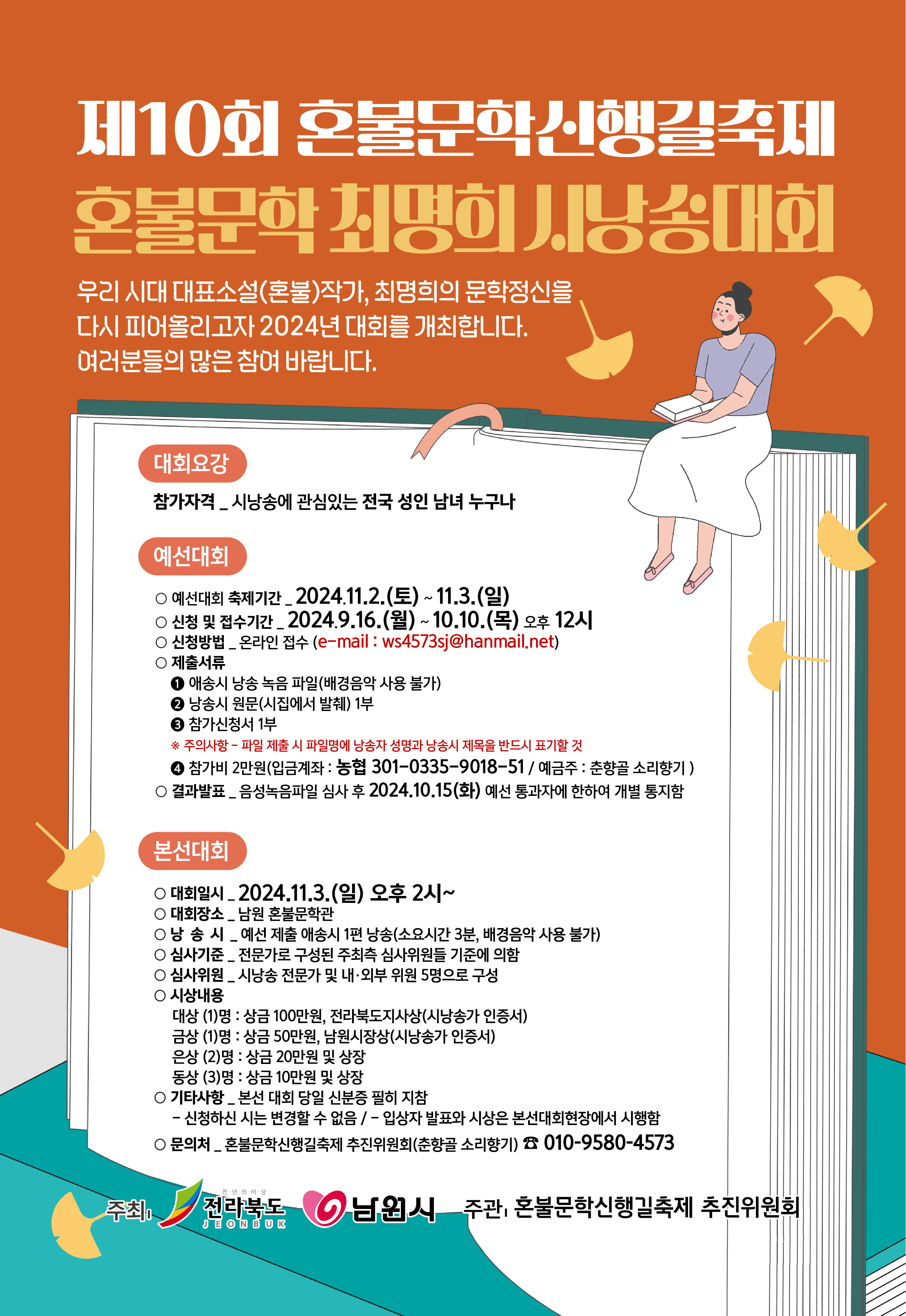 제2회 혼불문학 최명희 시낭송대회 안내 및 참가신청서 파일 업로드 작성자wiseperson4573|작성시간24.09.23|조회수98 목록 댓글 1 글자크기 작게가 글자크기 크게가 제2회 혼불문학 최명희 시낭송대회 참가신청서.hwp69.50KB 첨부파일첨부된 파일이 2개 있습니다. jpg 파일 시낭송대회.jpg 다운로드 hwp 파일 제2회 혼불문학 최명희 시낭송대회 참가신청서.hwp 다운로드 다음검색 현재 게시글 추가 기능 열기 북마크 공유하기 신고 센터로 신고 댓글 댓글 1 댓글쓰기 답글쓰기 댓글 리스트 작성자햇살 | 작성시간 24.09.23 공지를 쉽게 열고 참고할 수 있어 좋으네요 ~ 수고하세요 ~^^~ 댓글 전체보기