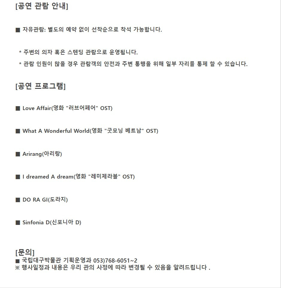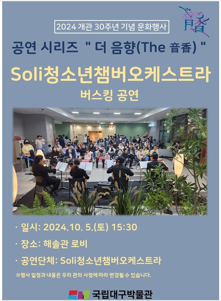 2024.10.5.(토). 15:30 / 개관 30주년 버스킹 공연시리즈 더 음향 10월 / Soli 청소년 챔버 오케스트라 작성자마술피리7|작성시간24.09.29|조회수33 목록 댓글 0 글자크기 작게가 글자크기 크게가 다음검색 현재 게시글 추가 기능 열기 북마크 공유하기 신고 센터로 신고 댓글 댓글 0 댓글쓰기 답글쓰기 댓글 리스트
