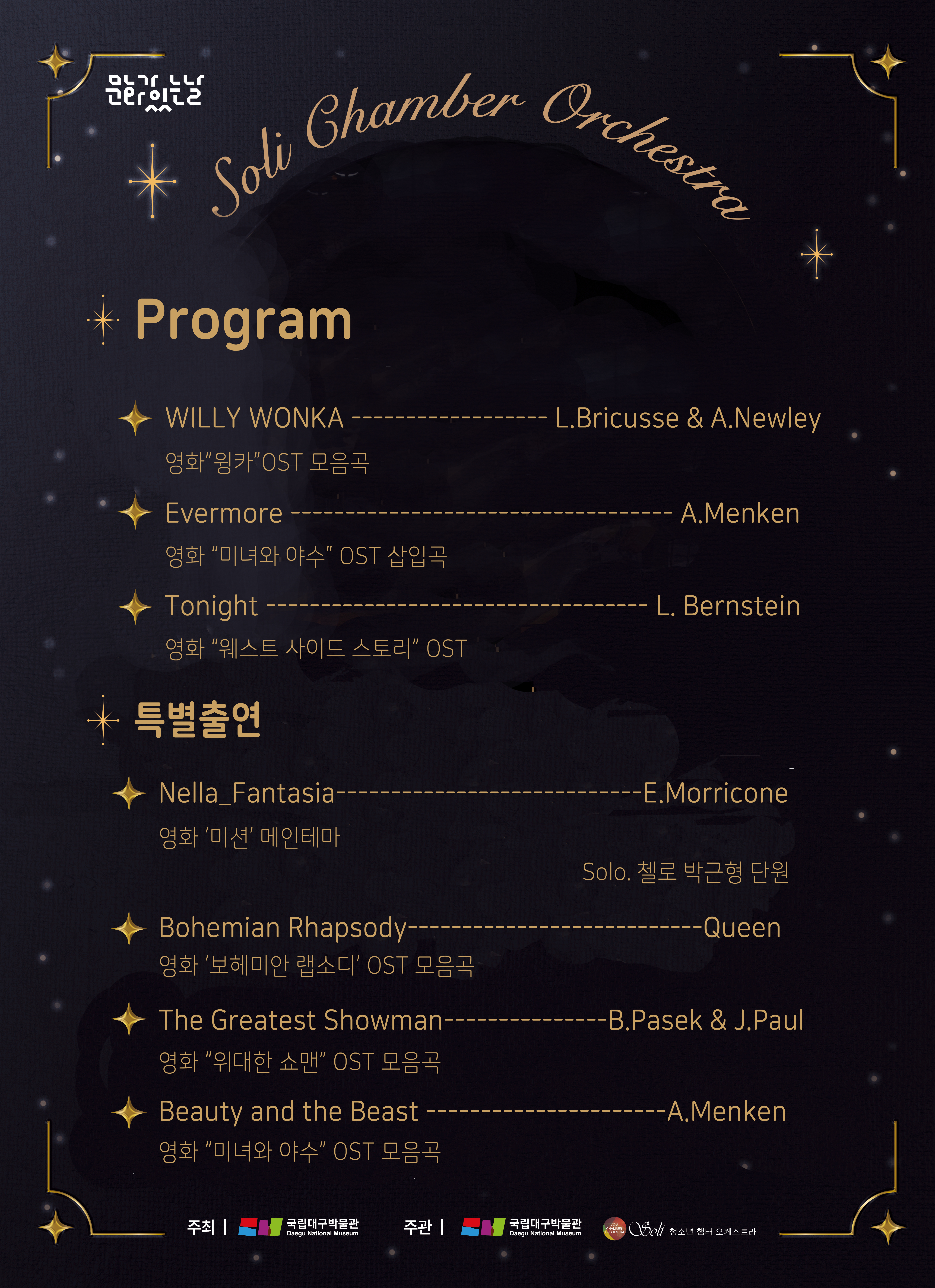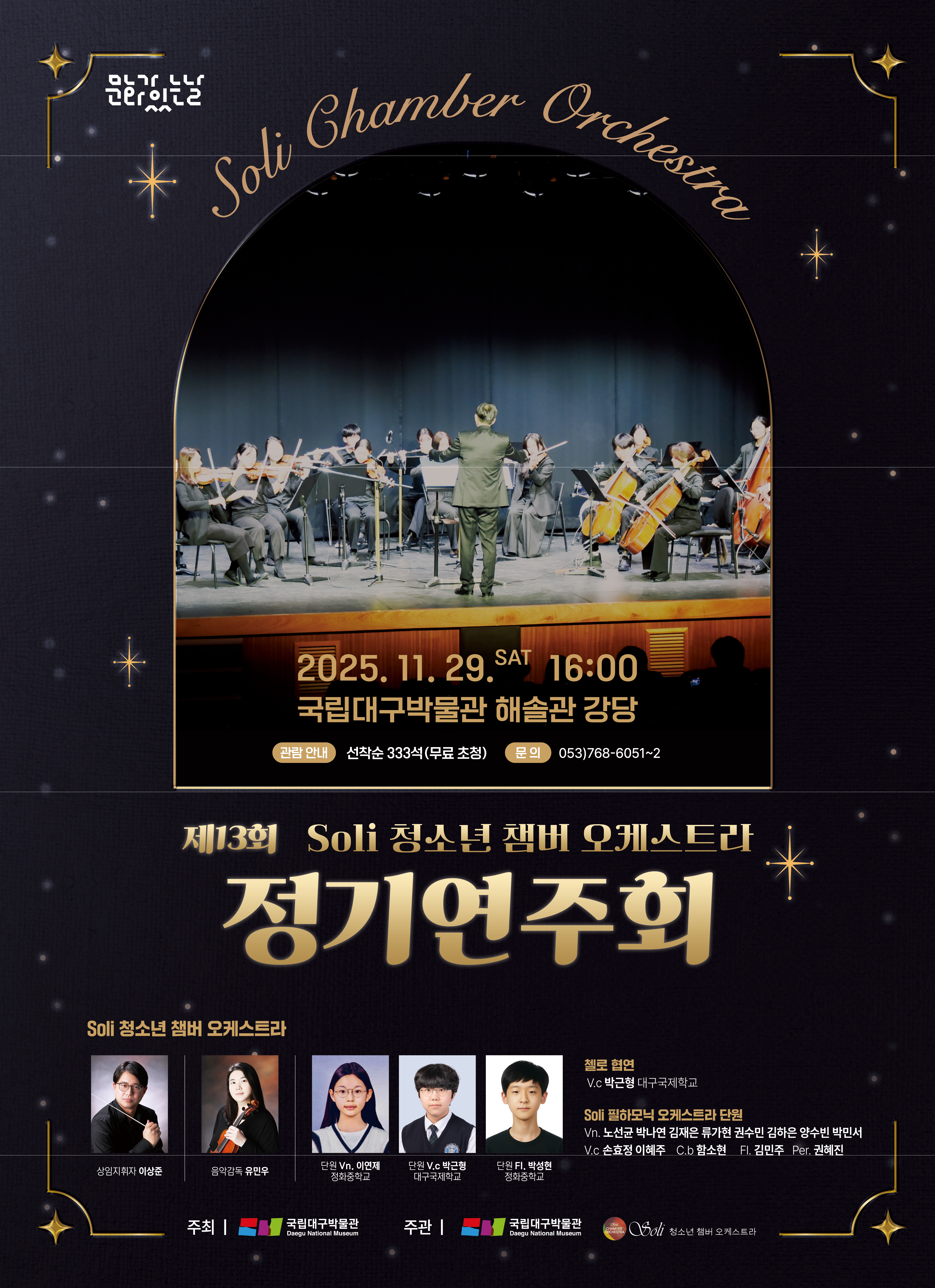 2025.11.29 (토) 오후 4시 / 국립대구박물관 "문화가 있는 날"Soli 청소년 챔버 오케스트라 제13회 정기연주회" 작성자마술피리7|작성시간25.11.15|조회수9 목록 댓글 0 글자크기 작게가 글자크기 크게가 다음검색 현재 게시글 추가 기능 열기 북마크 공유하기 신고 센터로 신고 댓글 댓글 0 댓글쓰기 답글쓰기 댓글 리스트
