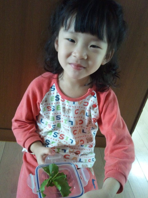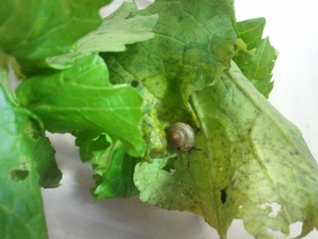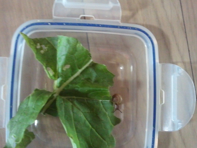 다경이가 뽑아온 무잎에 달팽이가