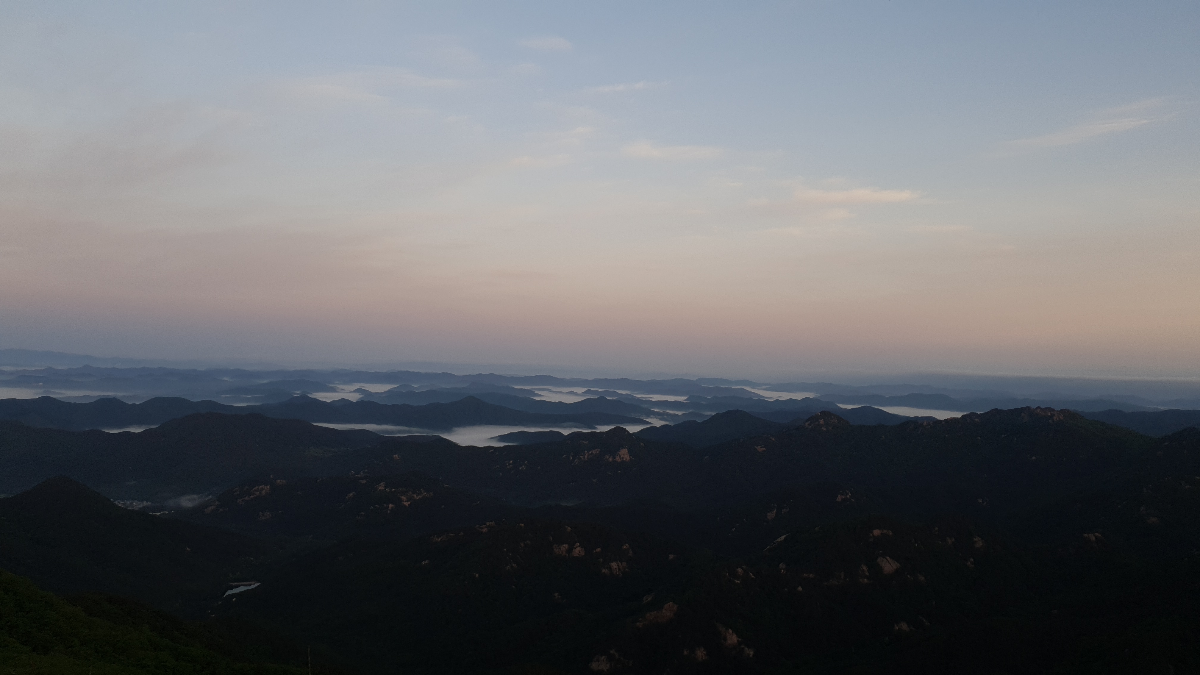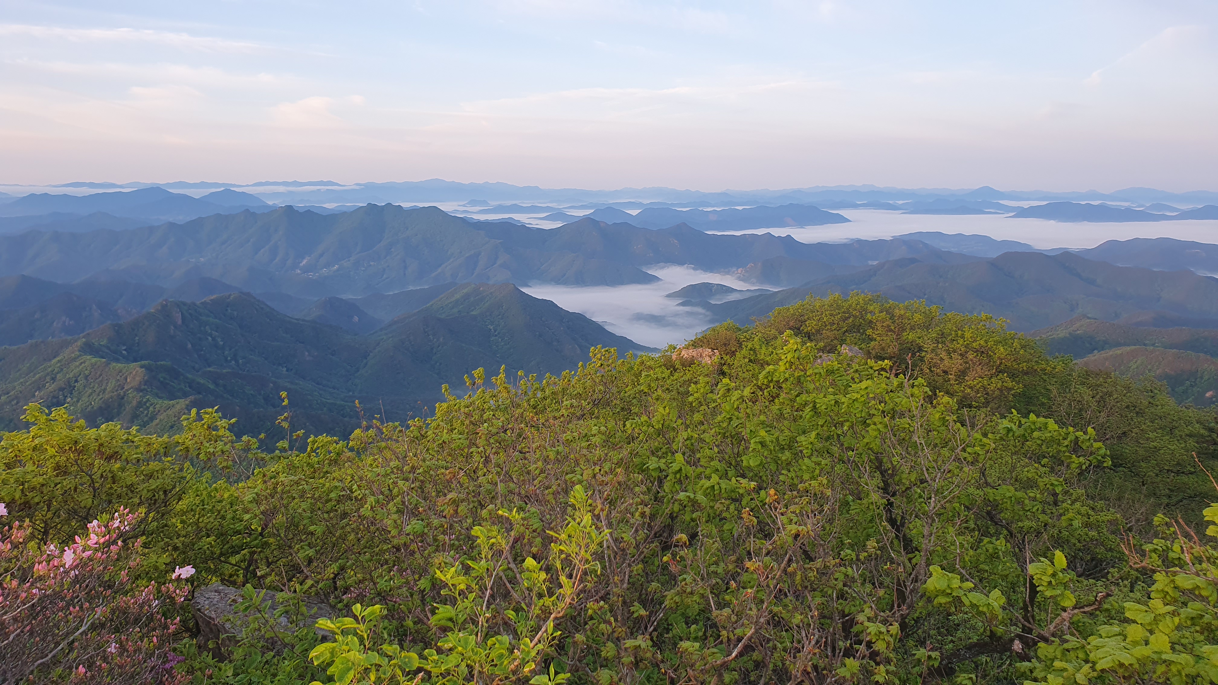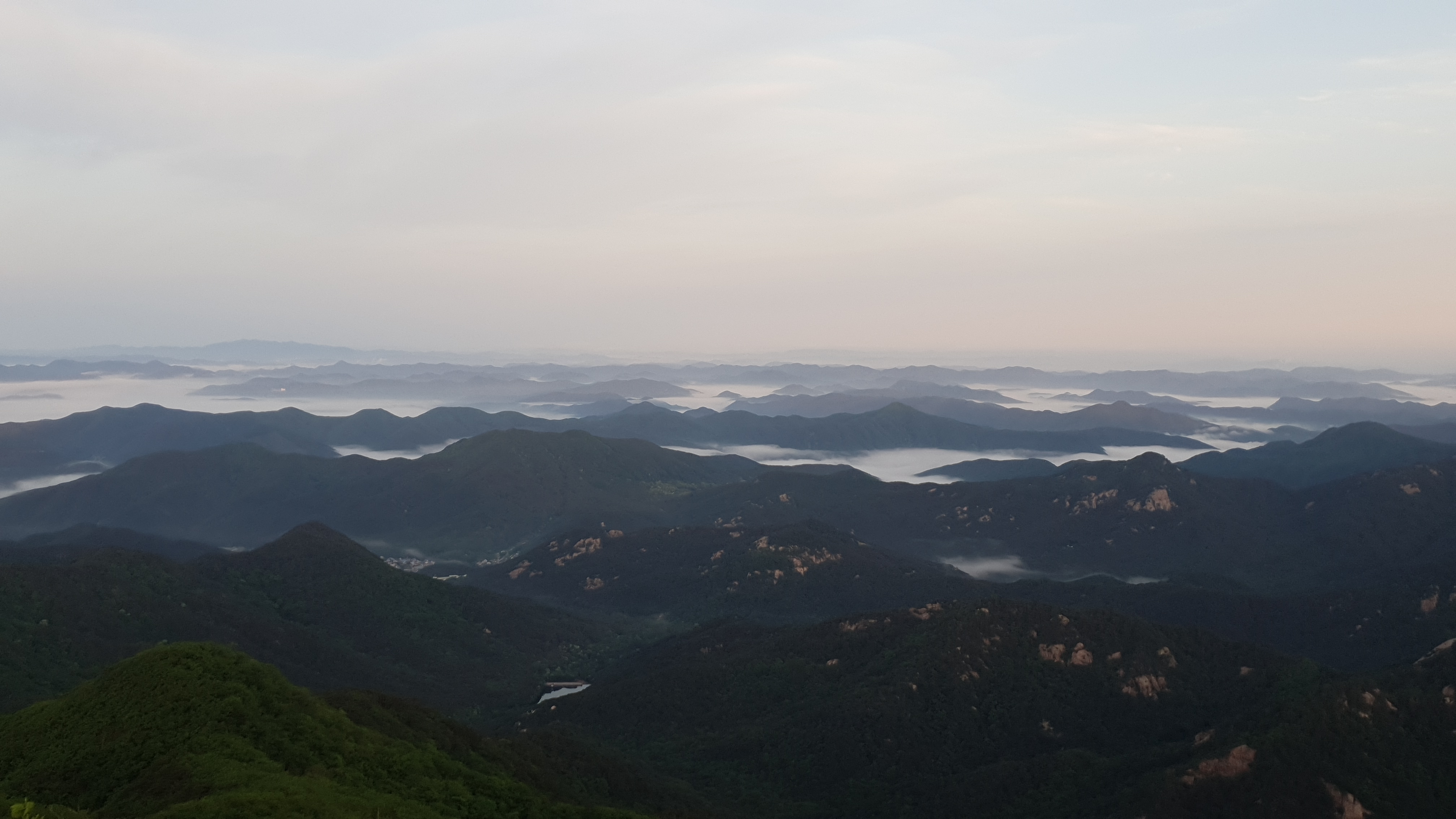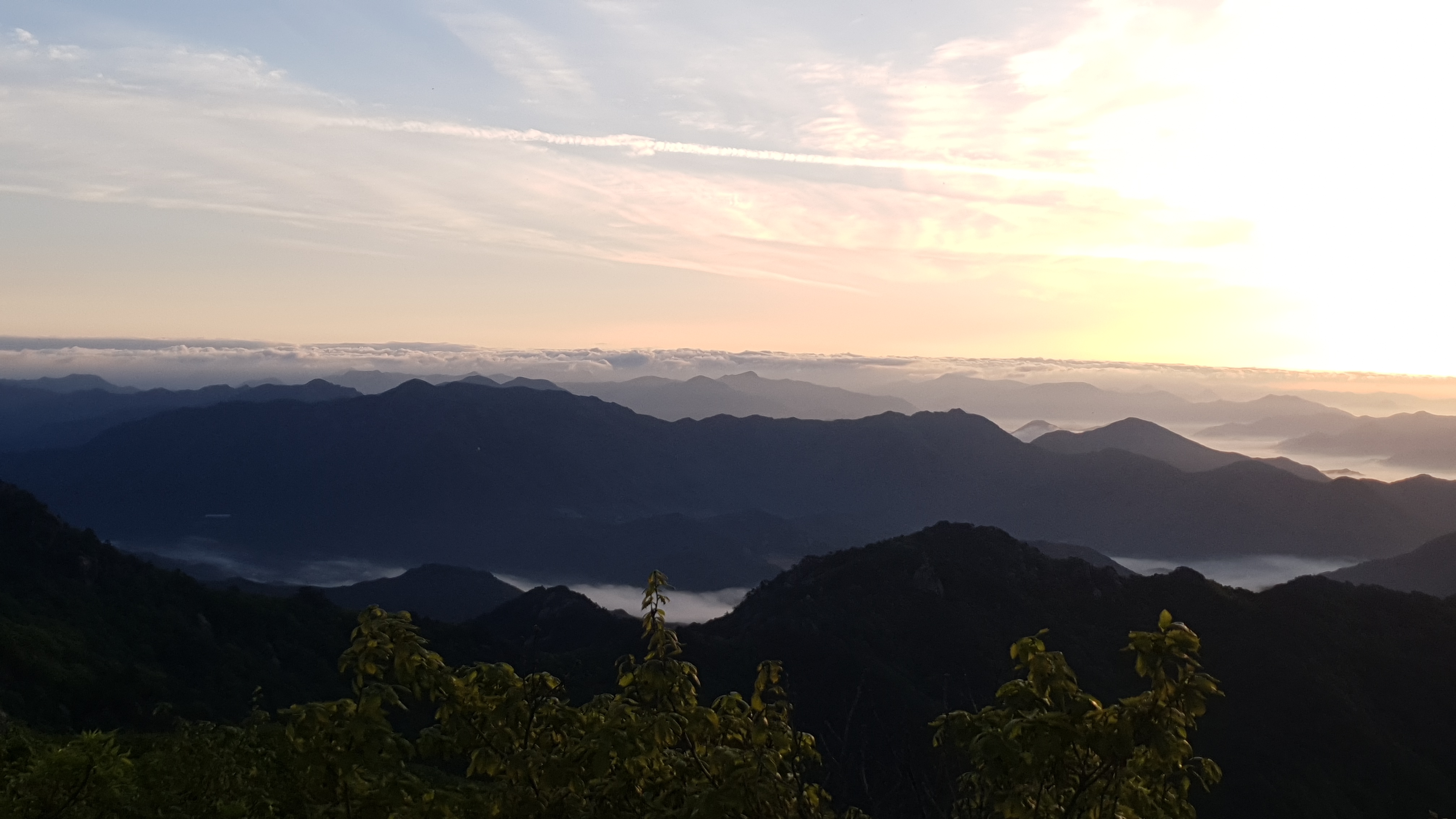 눈을 뜨고 시간을 보니 04시 45분 이다. 해 뜨는 시간이 05시 15분 라고 하니 일어나 준비하고 텐트 밖으로 나오자 붉은빛이 감돈다. 정상으로 사브작 사브작 올라가자 골짜구 골짜구 마다 와 허연물이 한 그득하다 ㅎㅎ 지금 바다에 온겨??