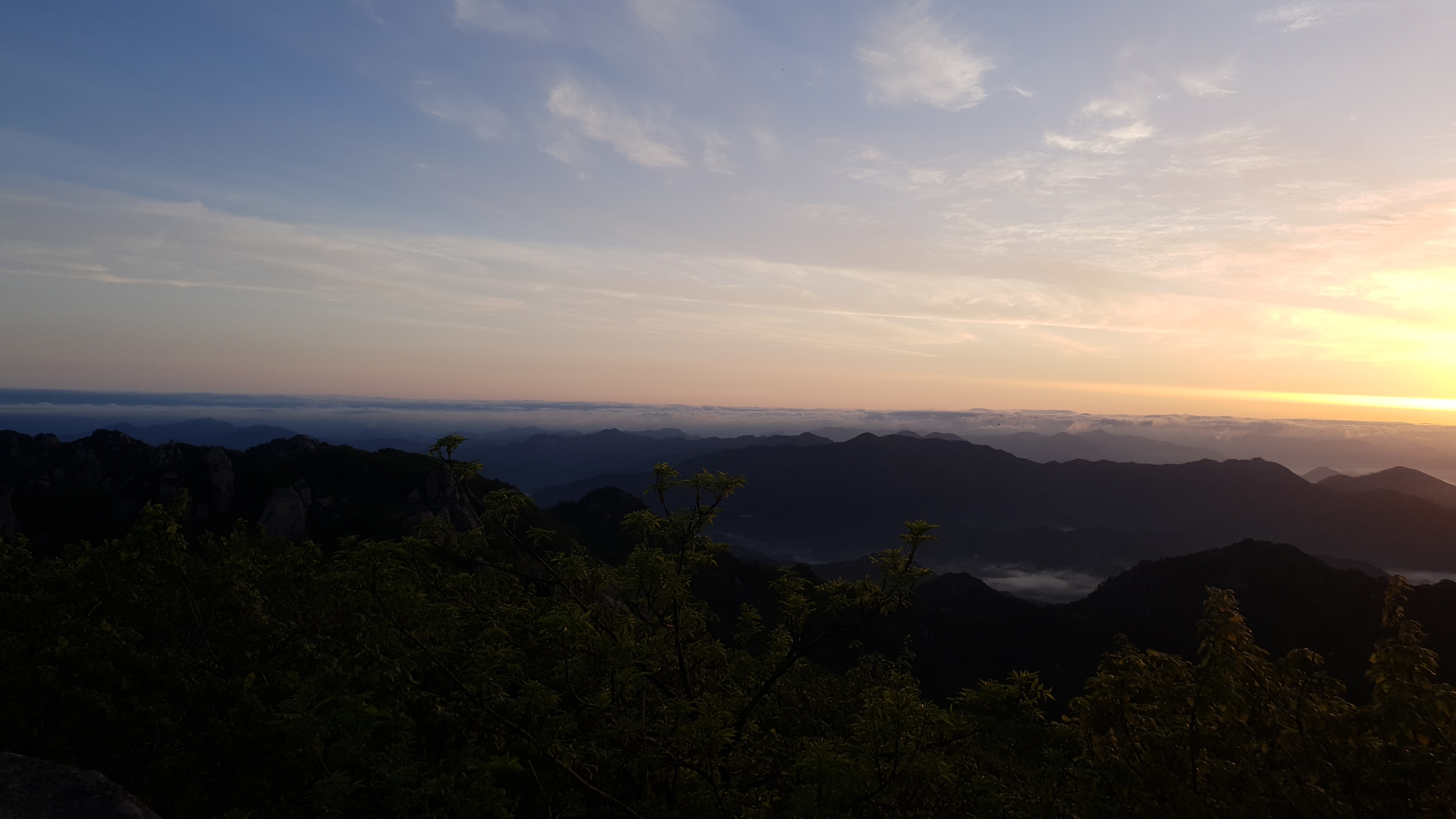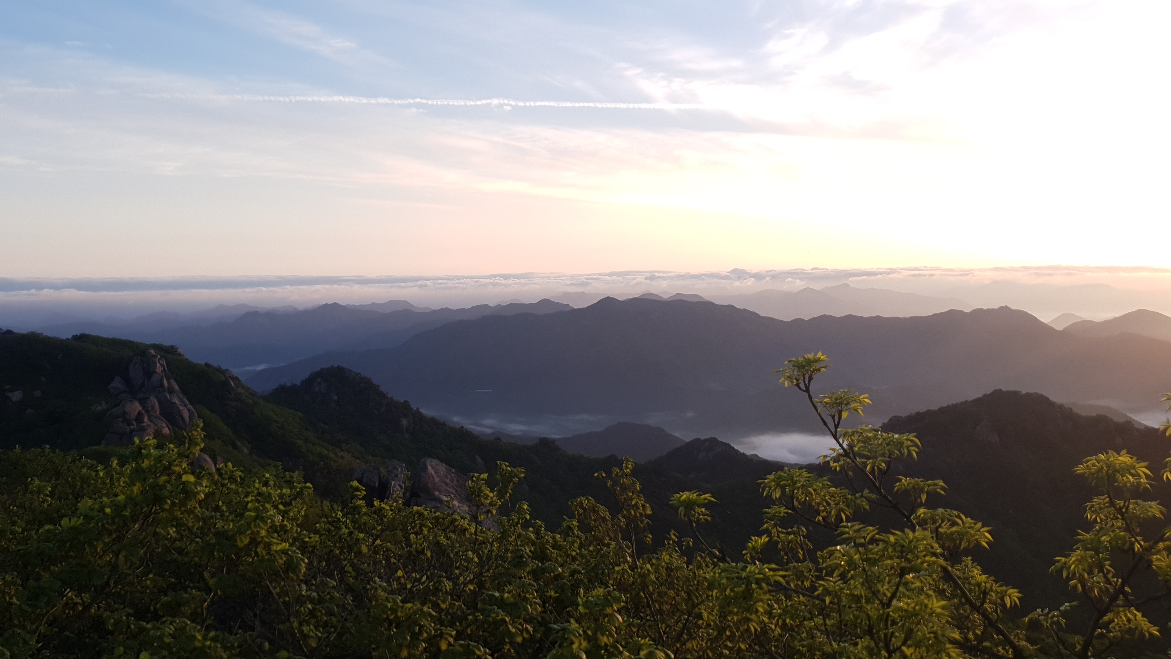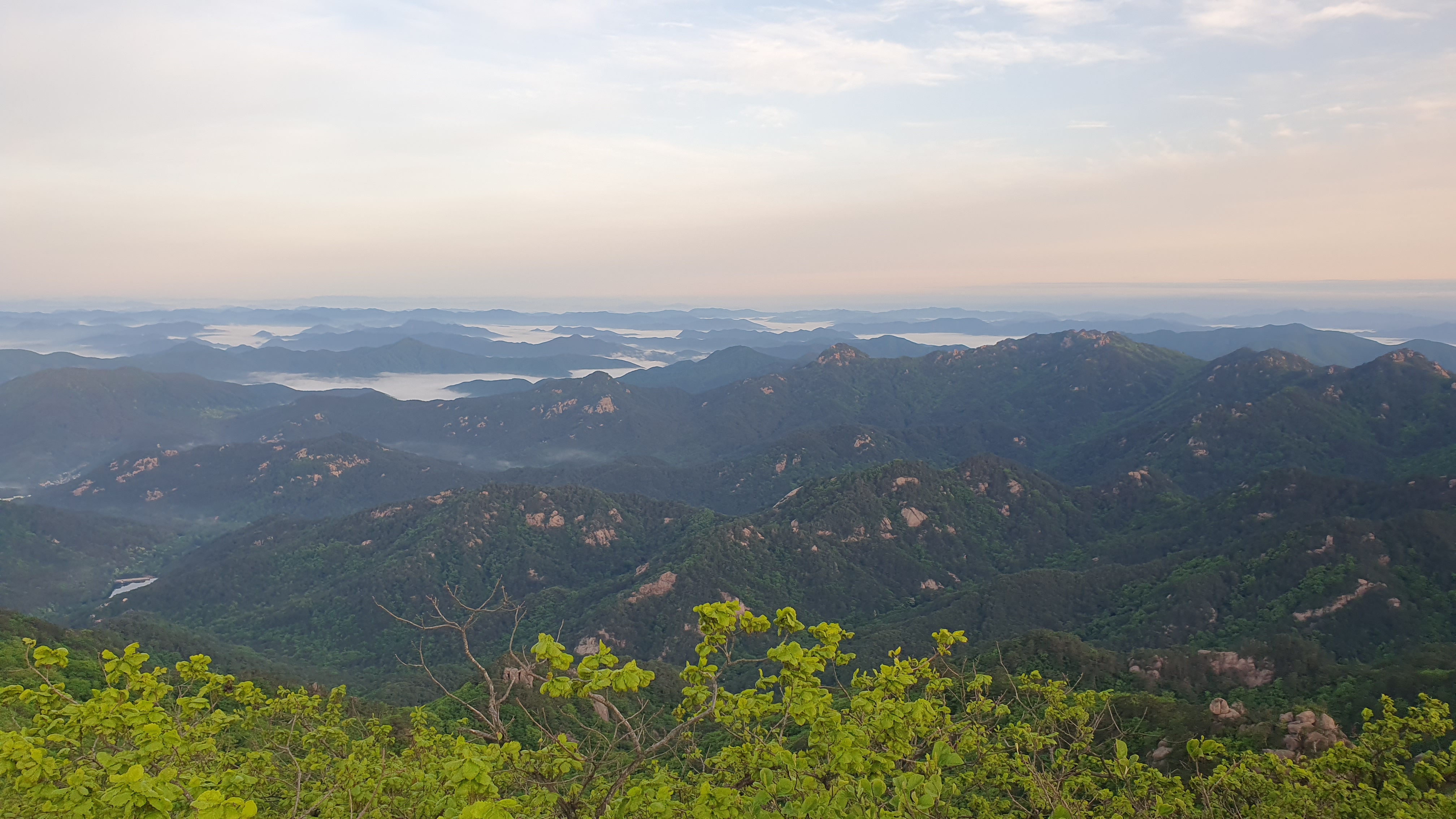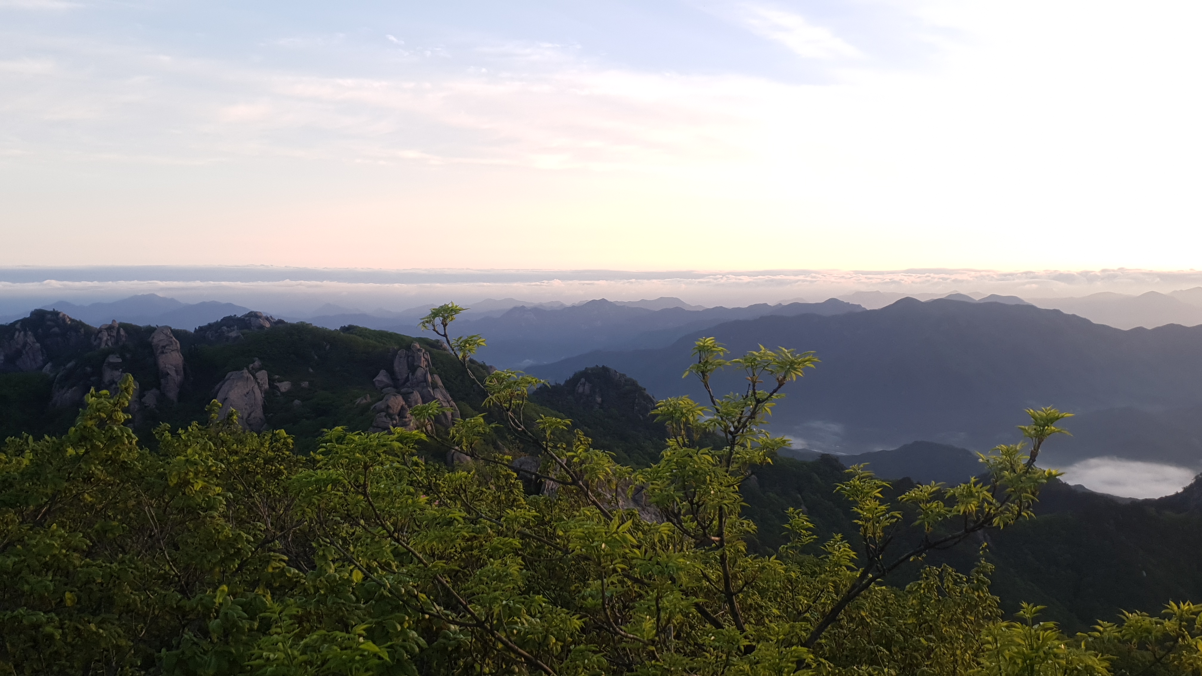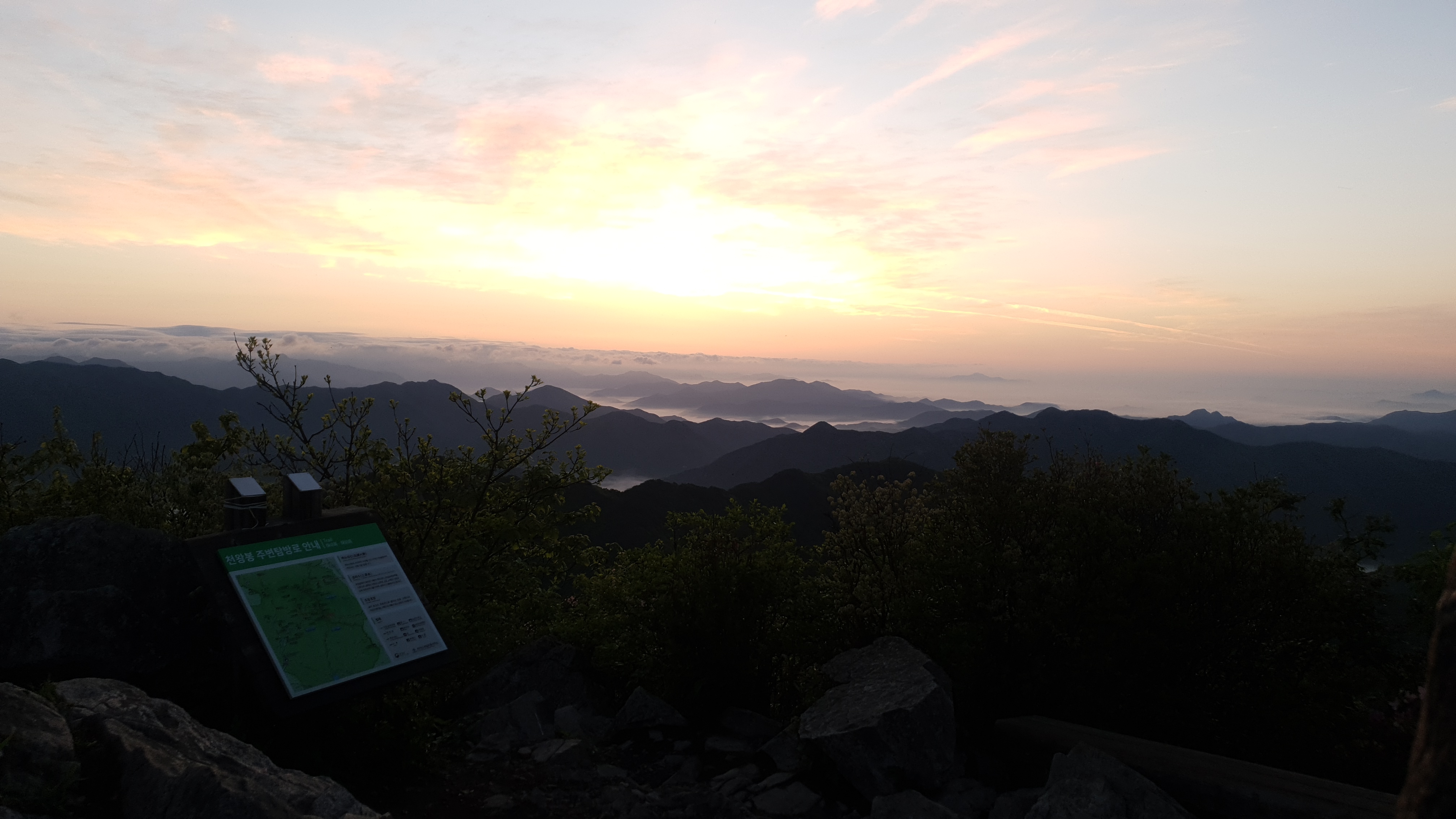 눈을 뜨고 시간을 보니 04시 45분 이다. 해 뜨는 시간이 05시 15분 라고 하니 일어나 준비하고 텐트 밖으로 나오자 붉은빛이 감돈다. 정상으로 사브작 사브작 올라가자 골짜구 골짜구 마다 와 허연물이 한 그득하다 ㅎㅎ 지금 바다에 온겨??