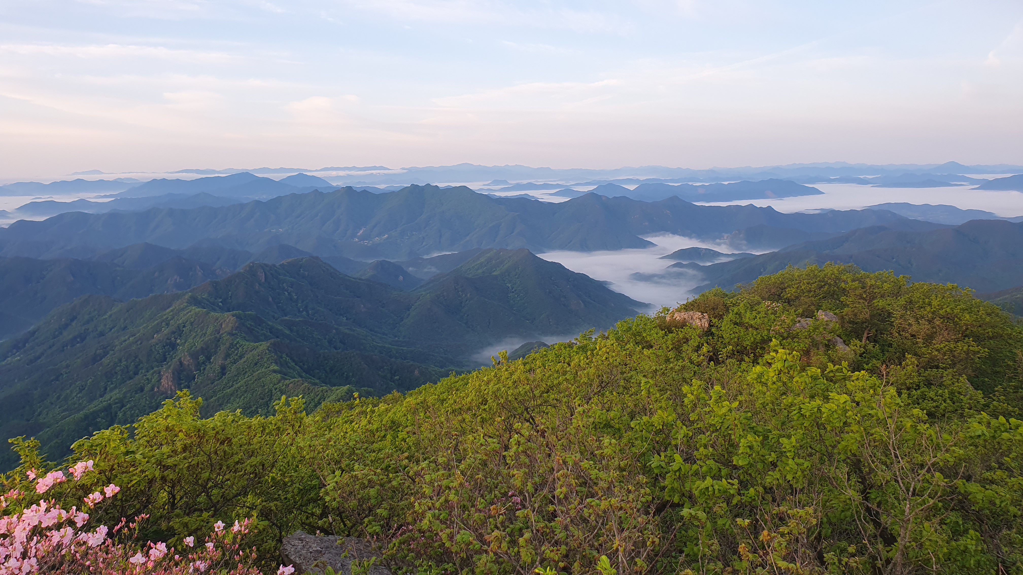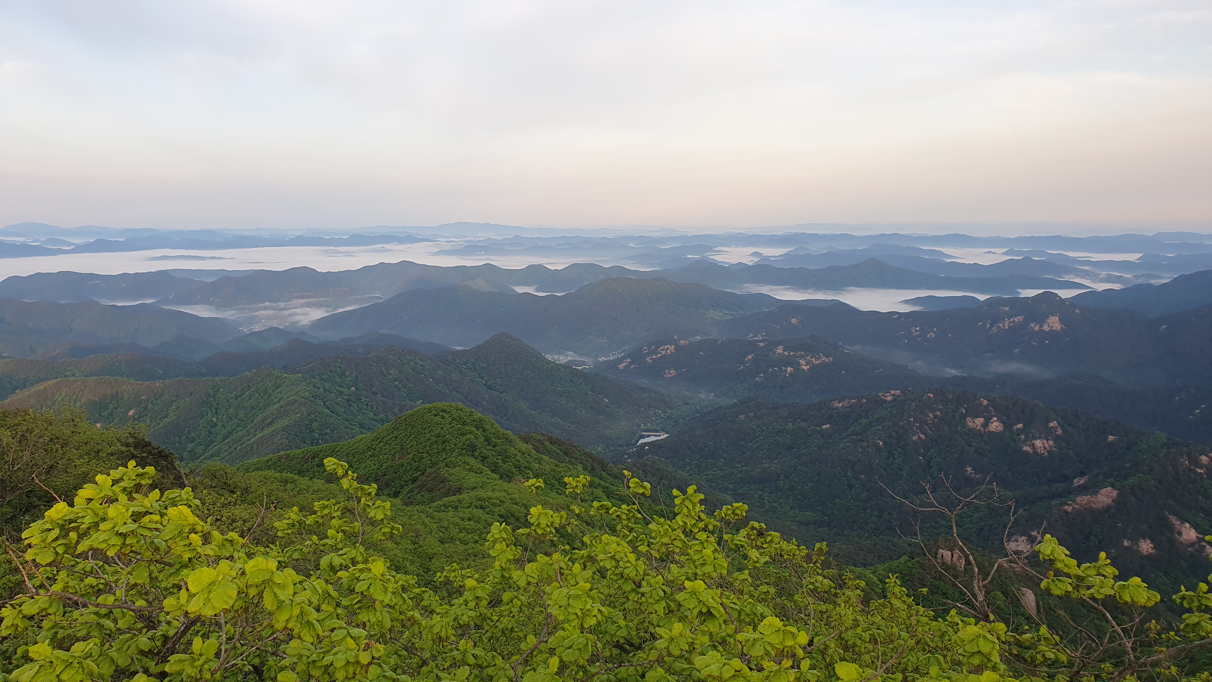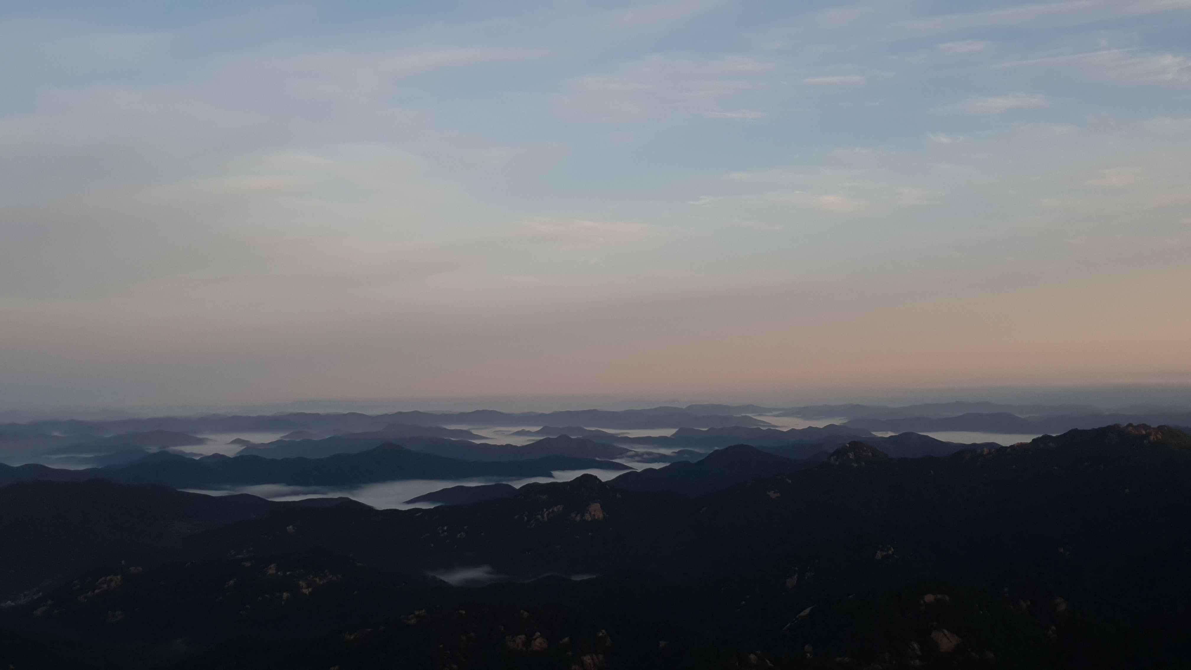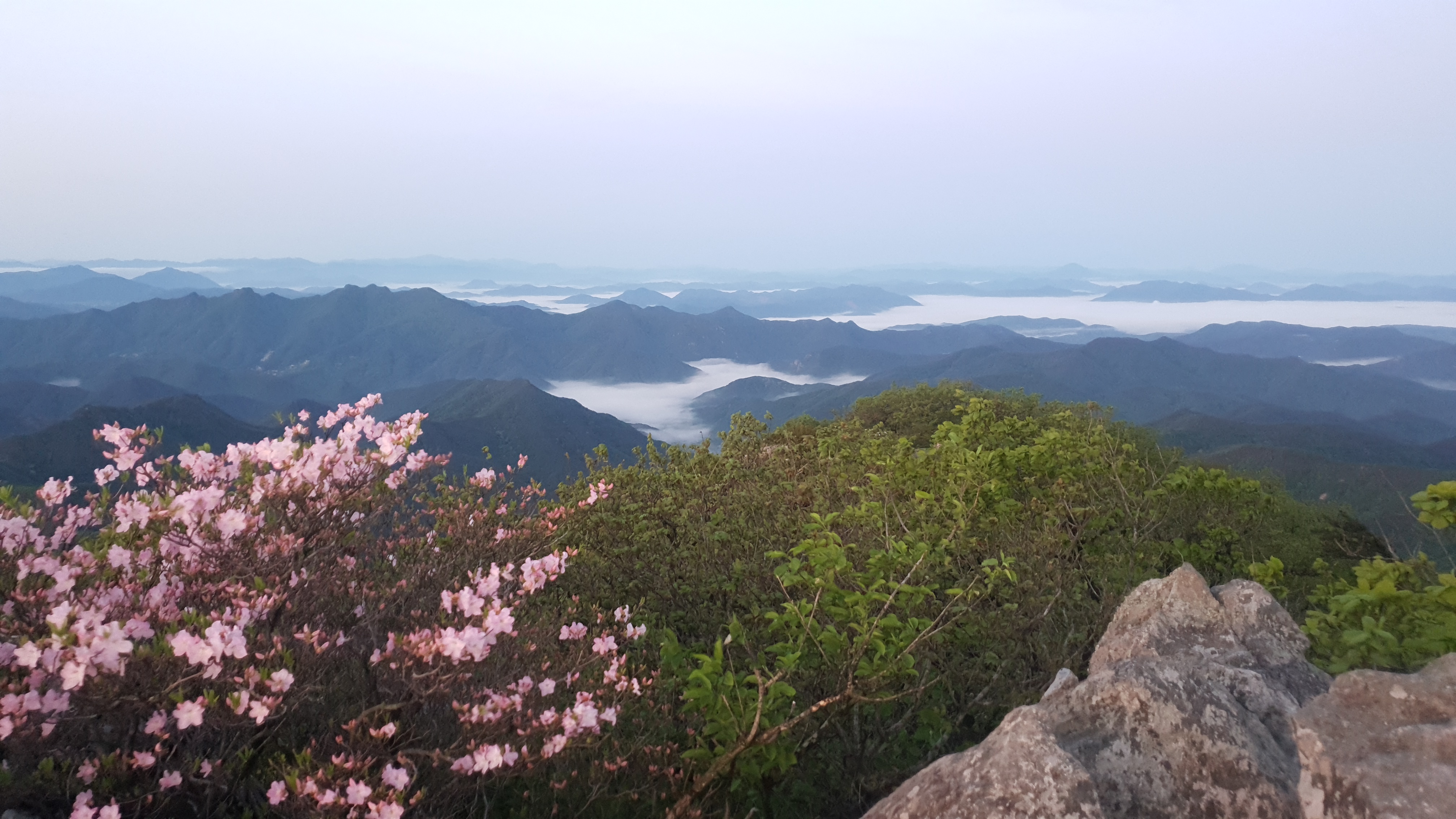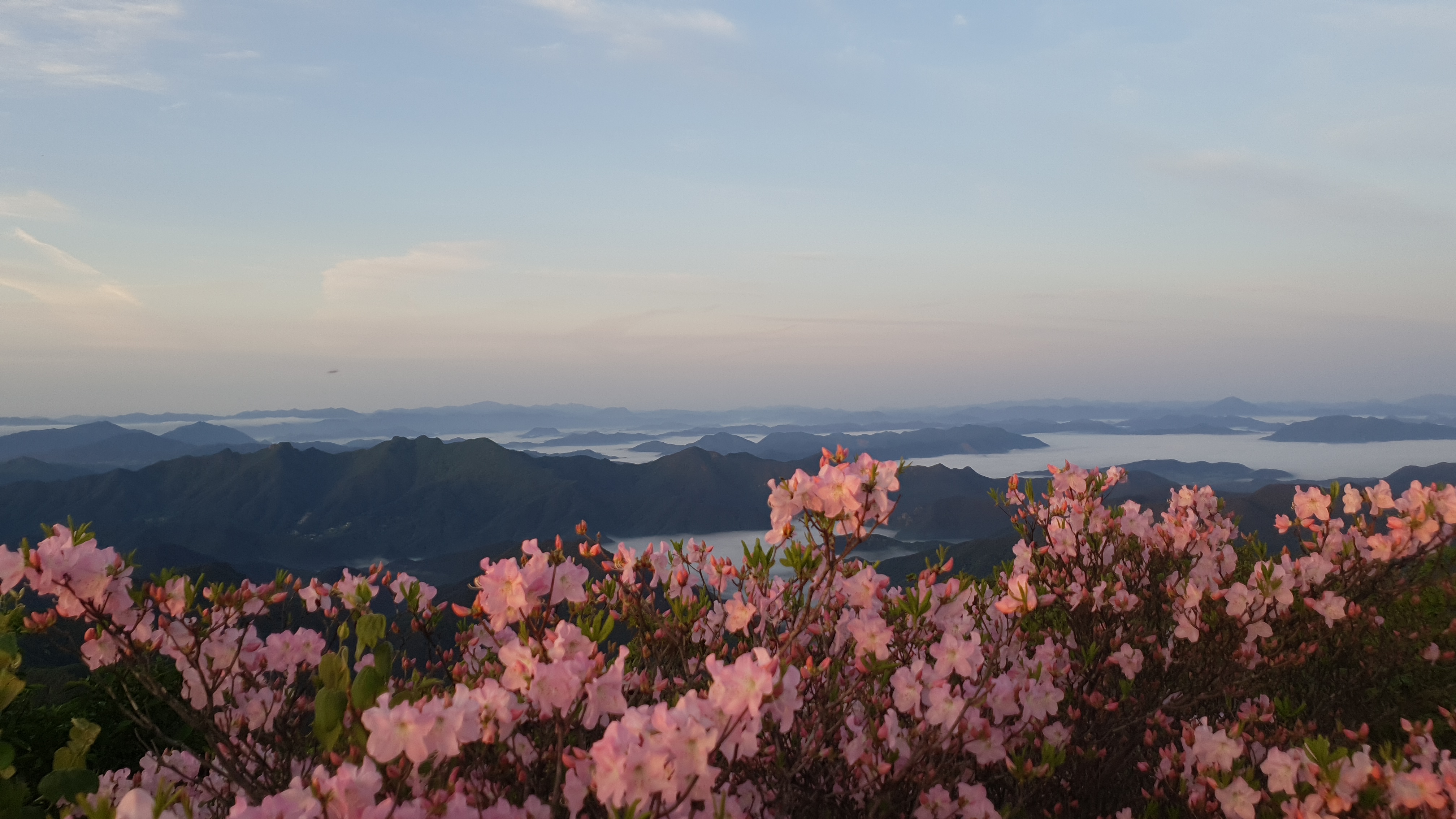 눈을 뜨고 시간을 보니 04시 45분 이다. 해 뜨는 시간이 05시 15분 라고 하니 일어나 준비하고 텐트 밖으로 나오자 붉은빛이 감돈다. 정상으로 사브작 사브작 올라가자 골짜구 골짜구 마다 와 허연물이 한 그득하다 ㅎㅎ 지금 바다에 온겨??