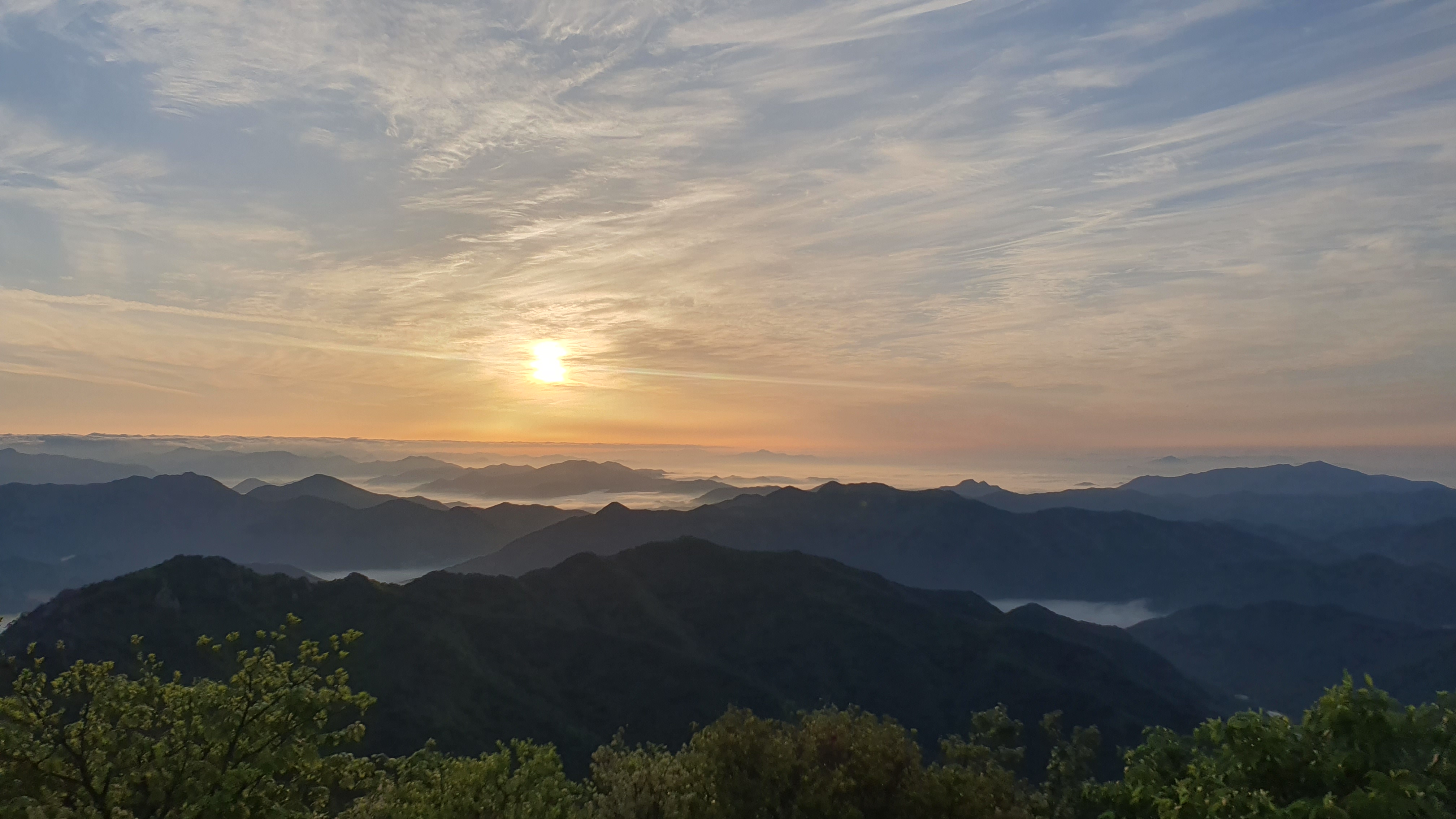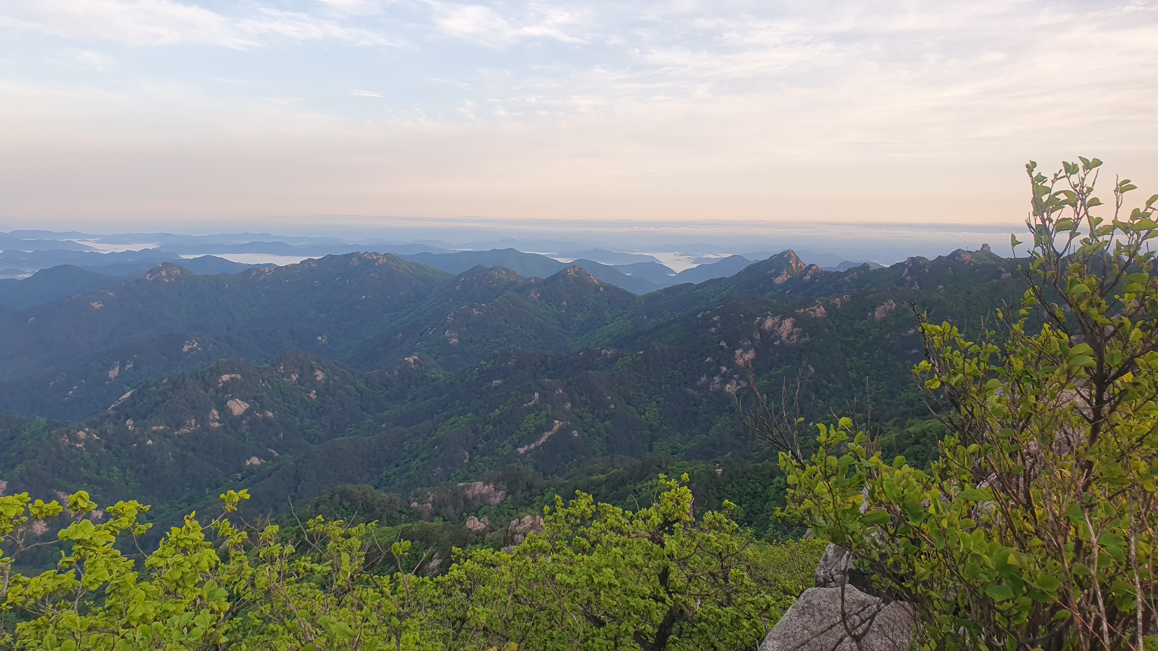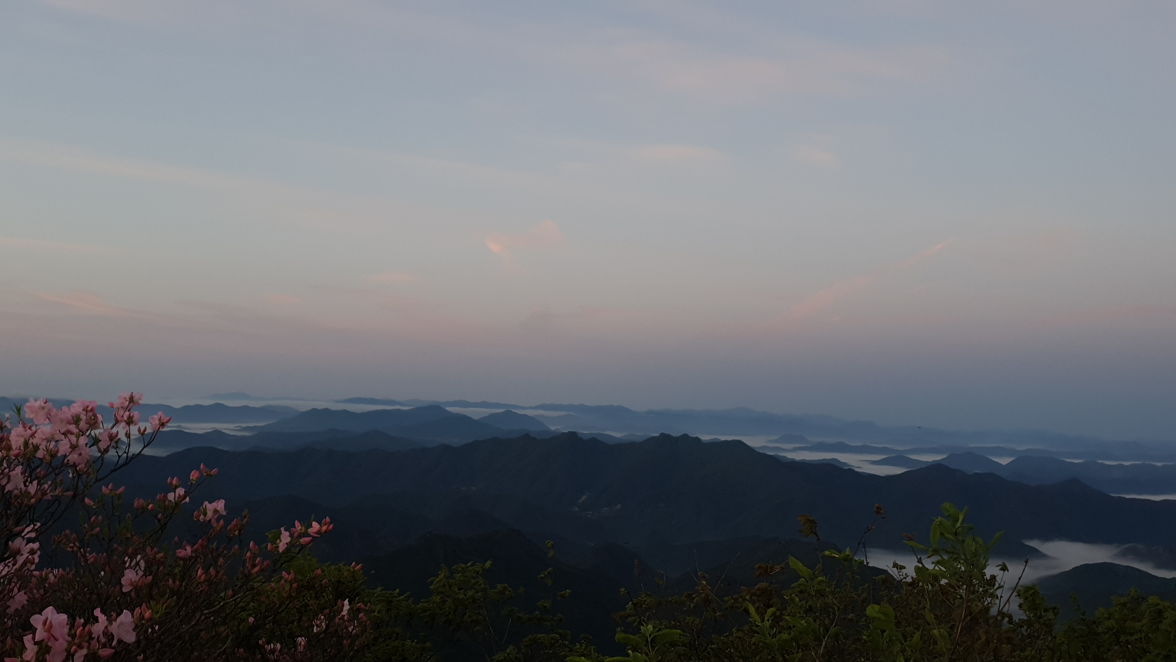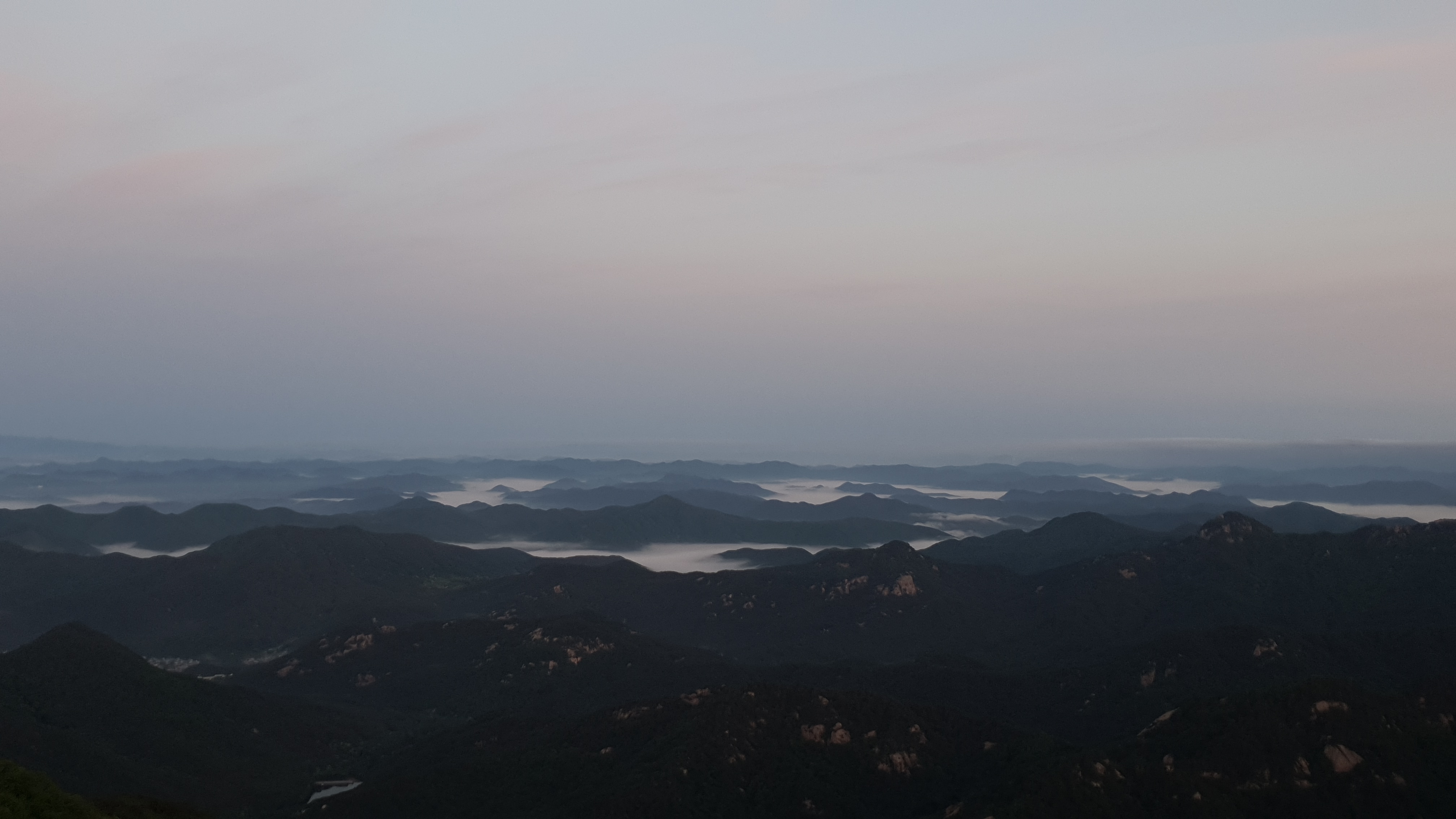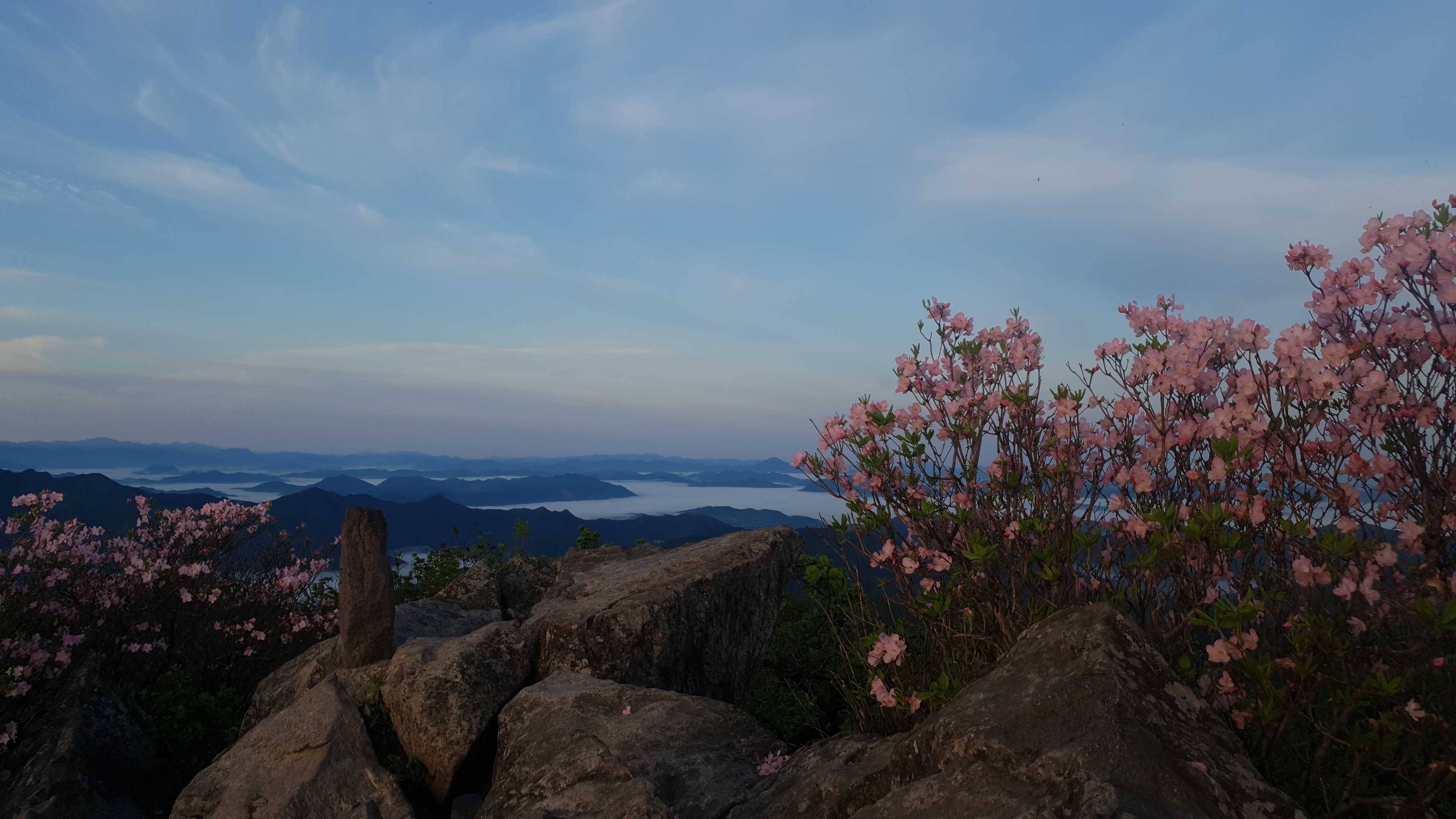 눈을 뜨고 시간을 보니 04시 45분 이다. 해 뜨는 시간이 05시 15분 라고 하니 일어나 준비하고 텐트 밖으로 나오자 붉은빛이 감돈다. 정상으로 사브작 사브작 올라가자 골짜구 골짜구 마다 와 허연물이 한 그득하다 ㅎㅎ 지금 바다에 온겨??