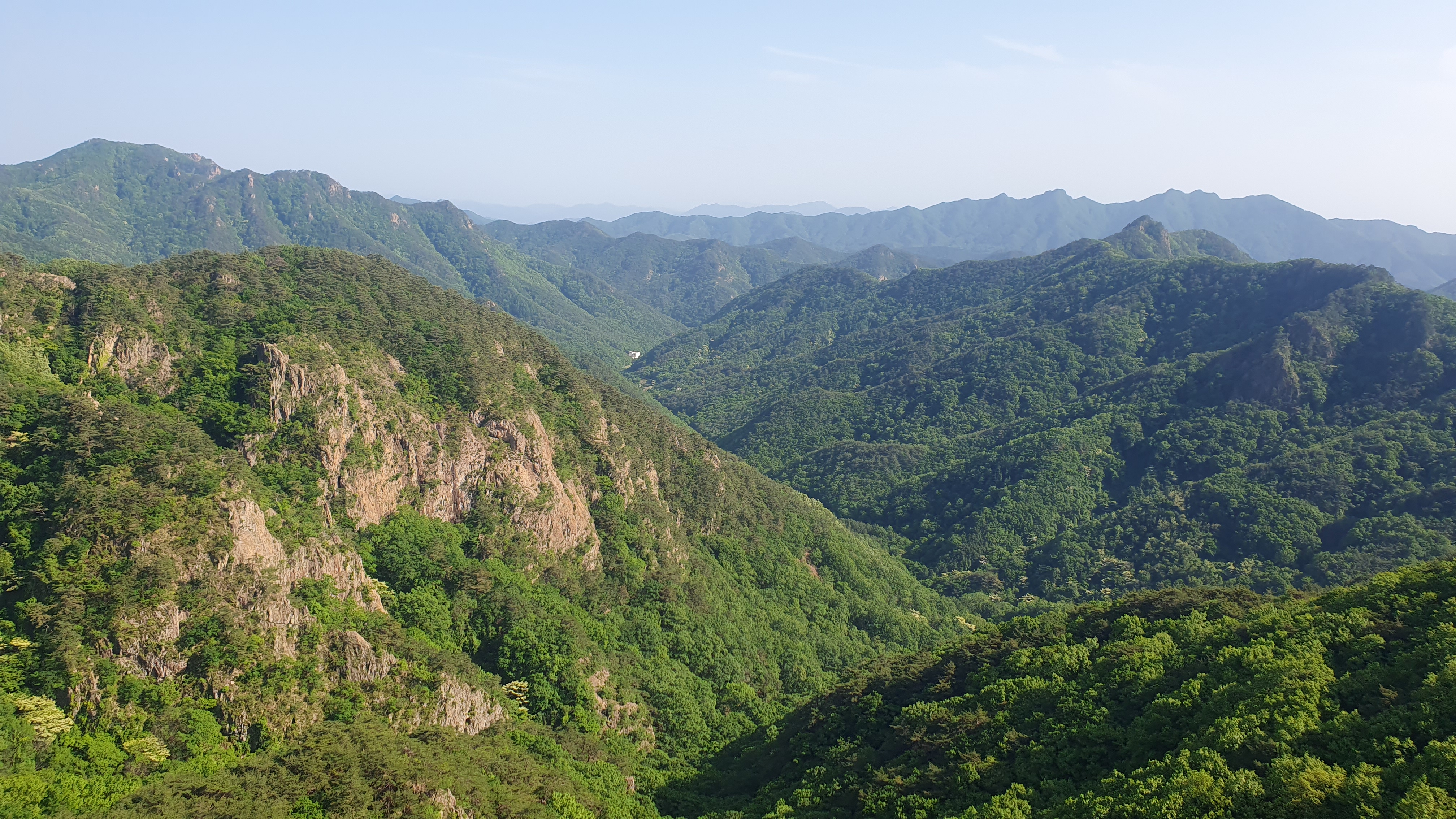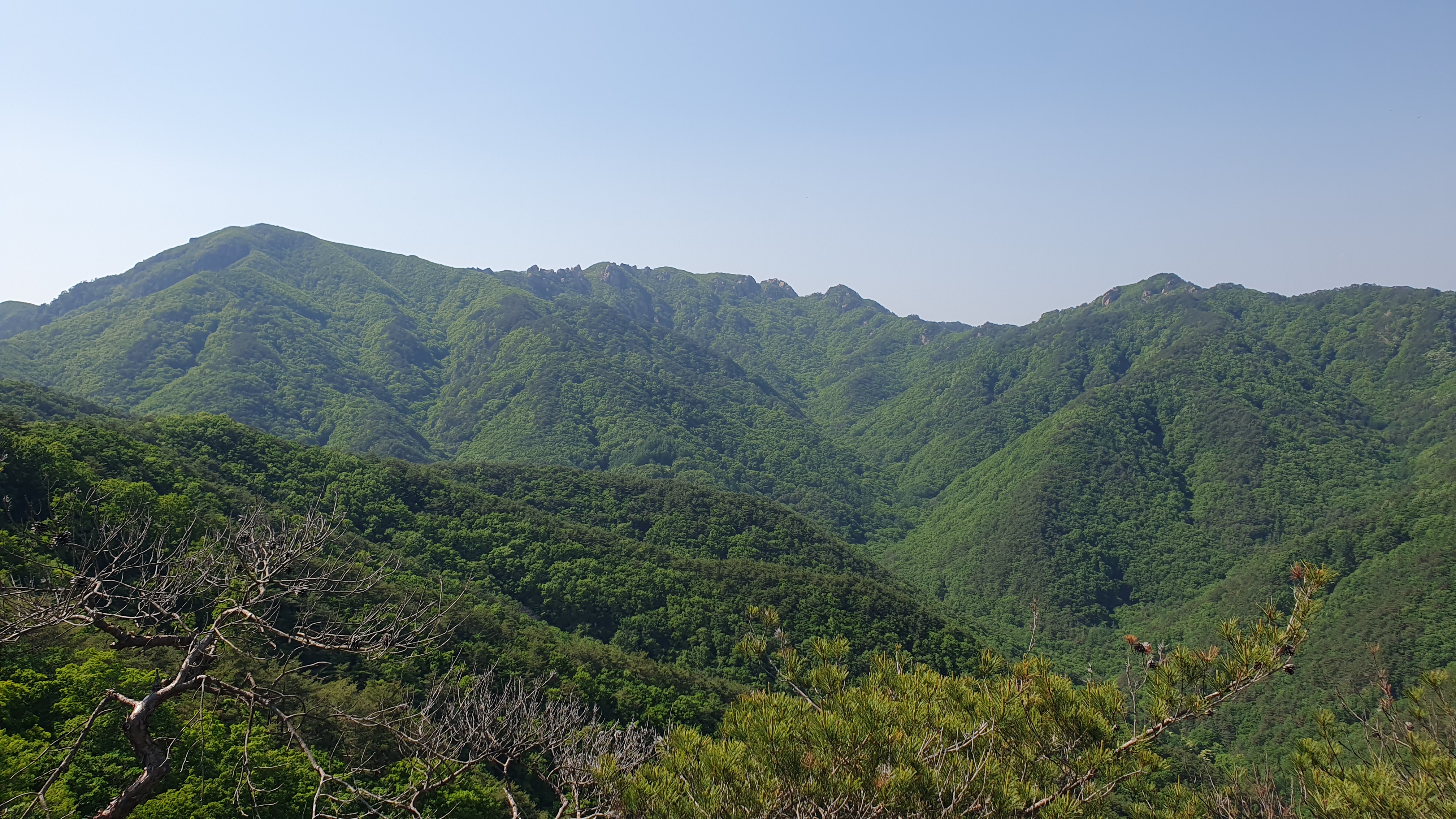 왼쪽 백악산 ,도명산, 가운데 청화산~조항산~대아산 대간능선, 앞 속리 동릉
