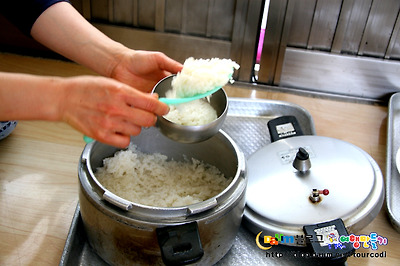 쏘가리 매운탕을 주문하자마자 남평 들에서 직접 재배한 쌀로 압력밥솥에 밥을 지어 들고 와서 밥을 퍼