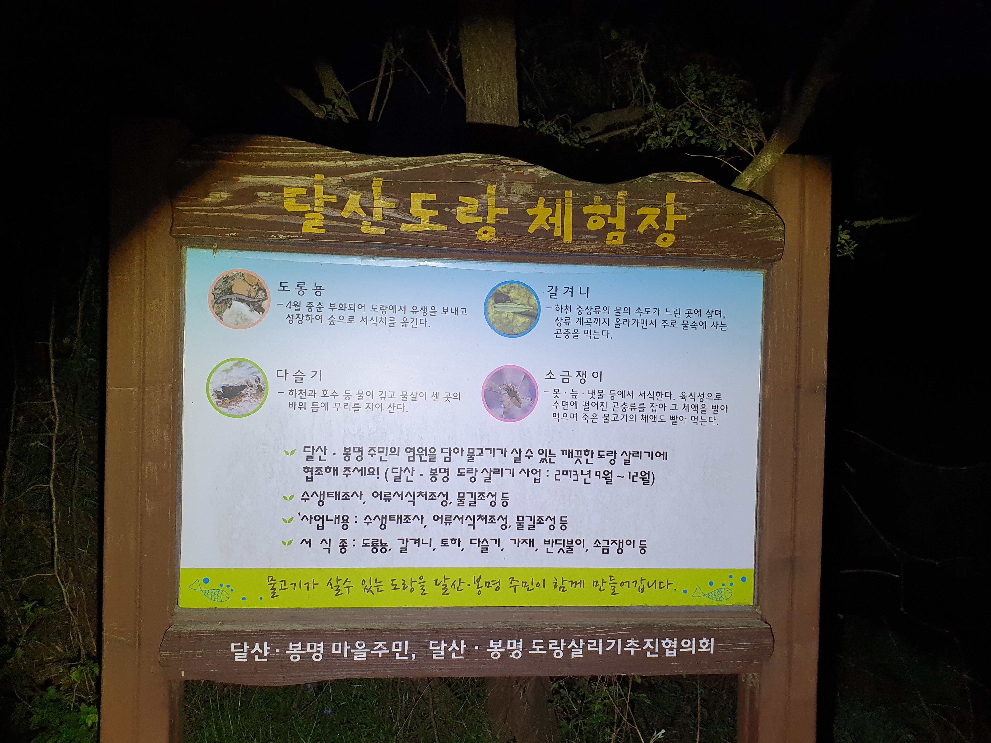 달산도랑체험장 안내판이 있고 실개천을 건너간다