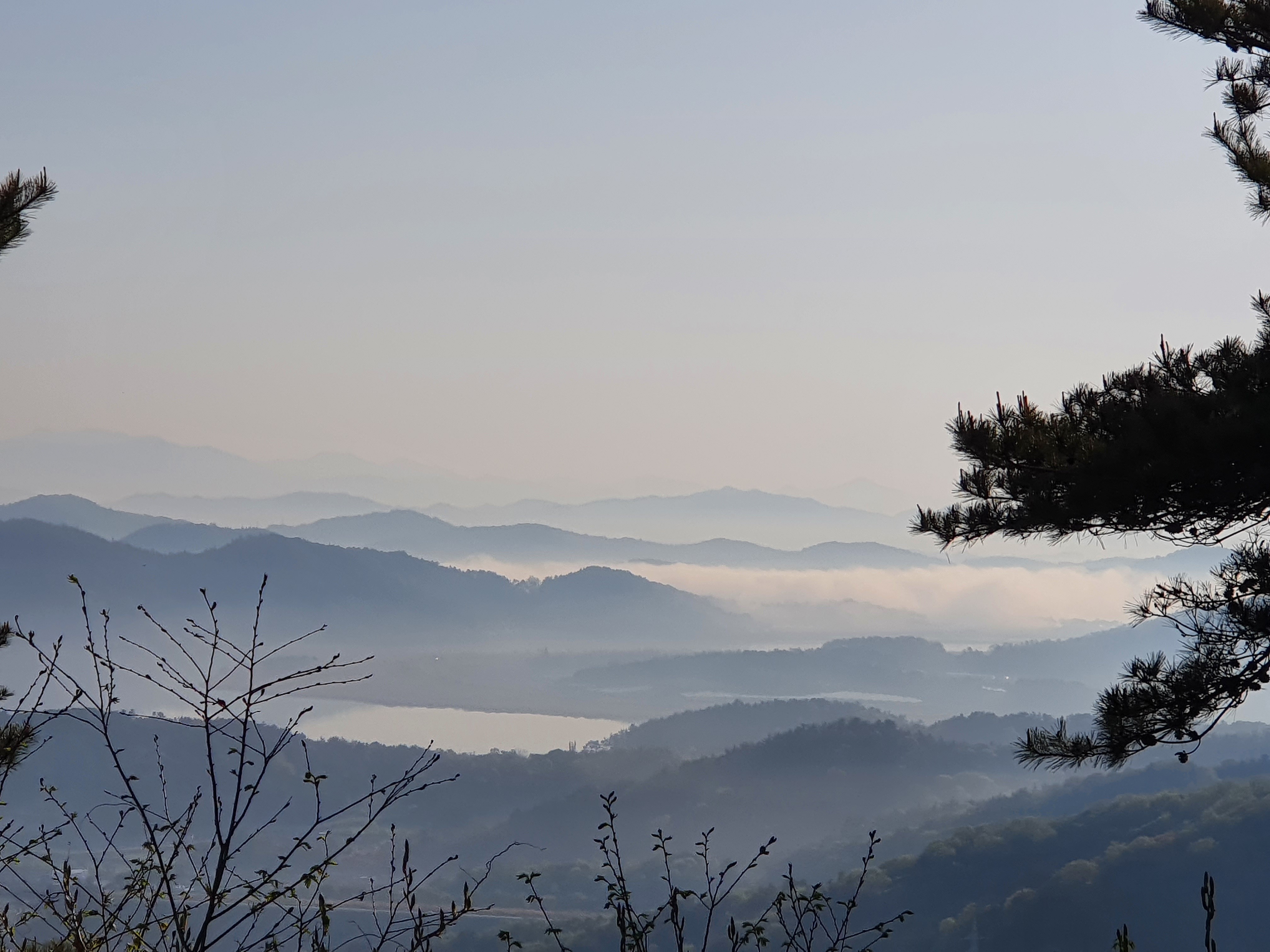 영산강 물안개가 피어오르는 가운데 나지막히 흐르는 산산산 산줄기들