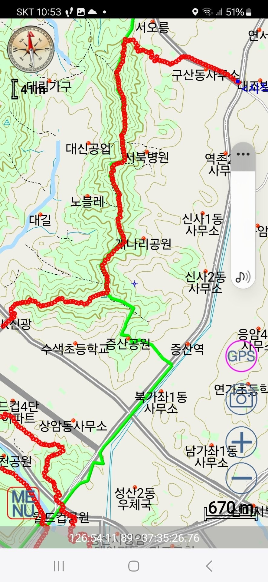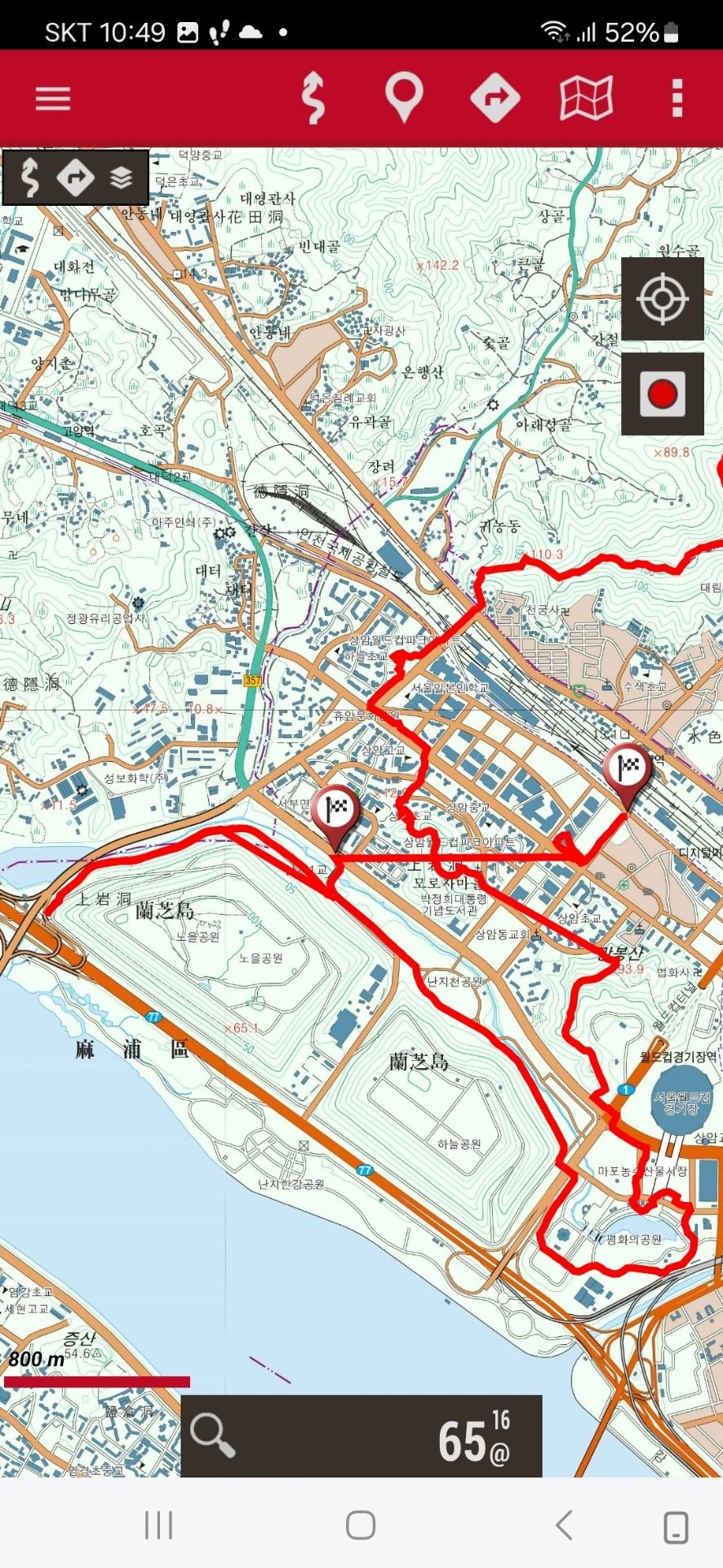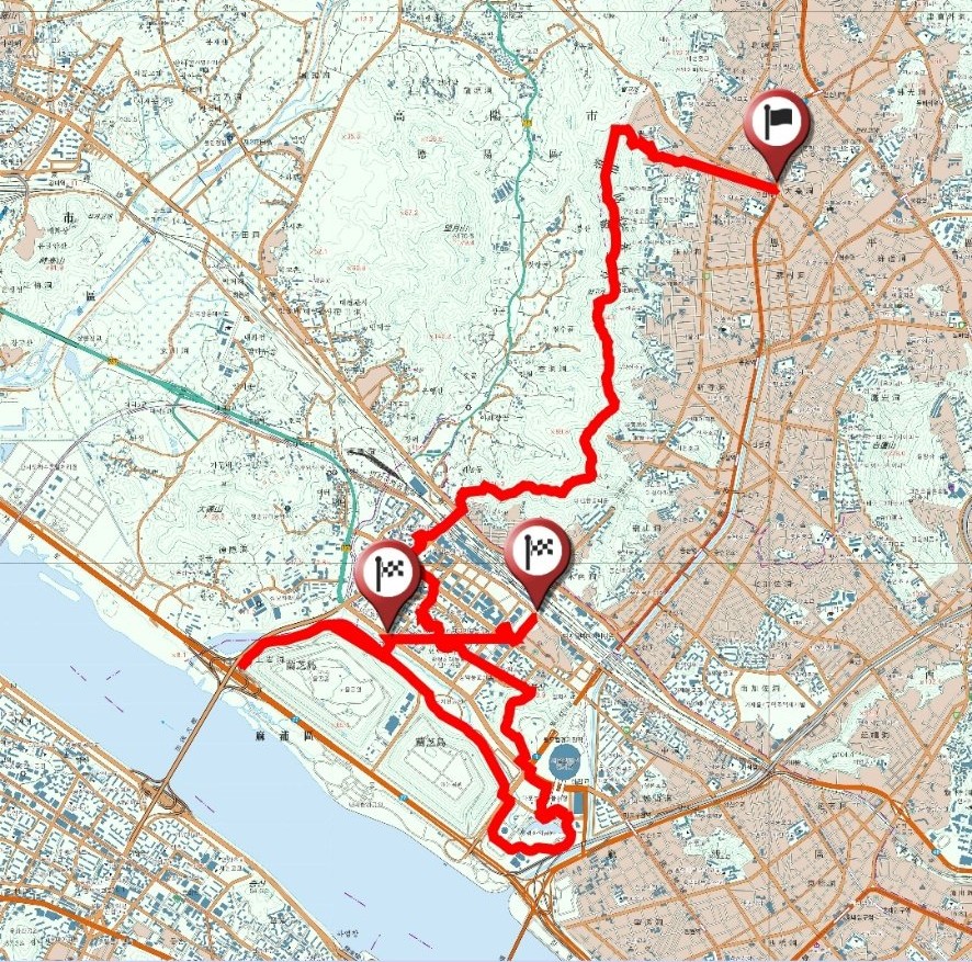반홍산으로 꺽이는 지점, 부엉이산에서 내려가는 지점, 상암산에서 내려가는지점, 매봉산에서 내려가는지점, 평화호수를 한바퀴도는 과정, 하늘공원에서 내려가는지점, 노을공원 통과하는방법