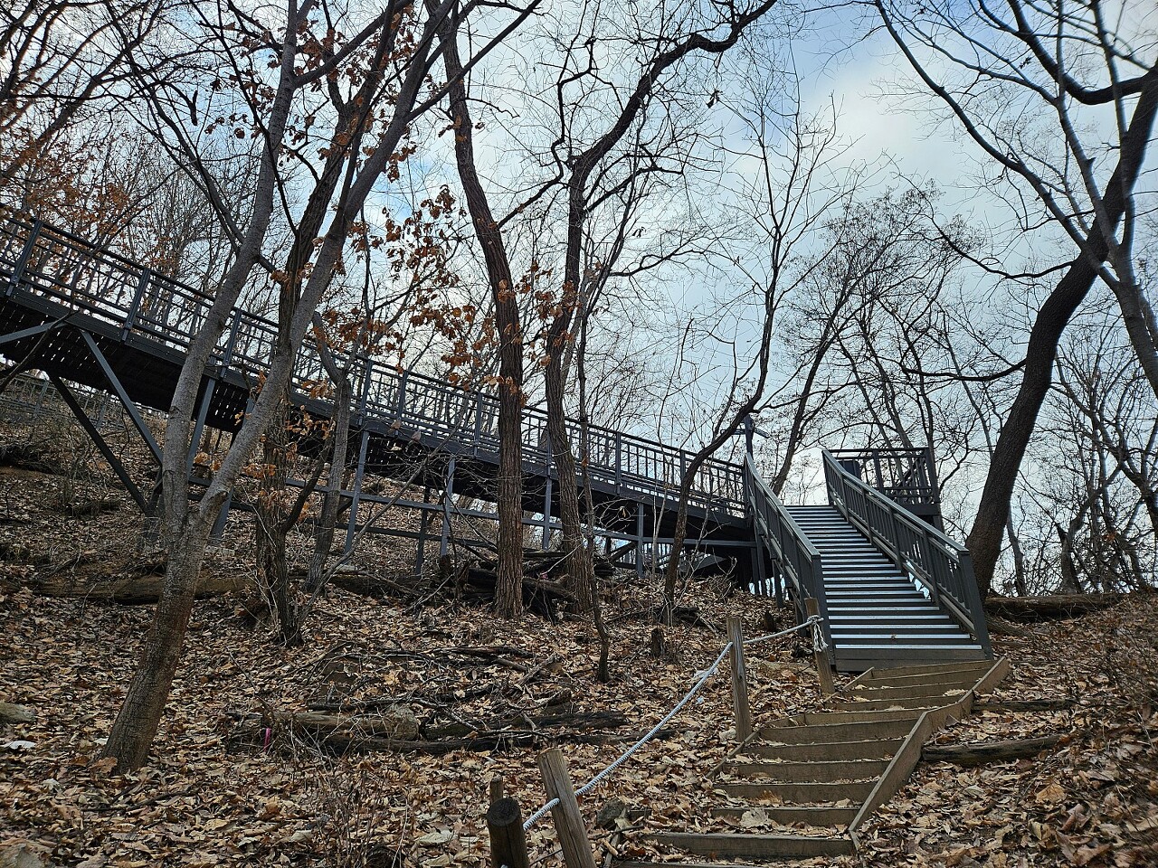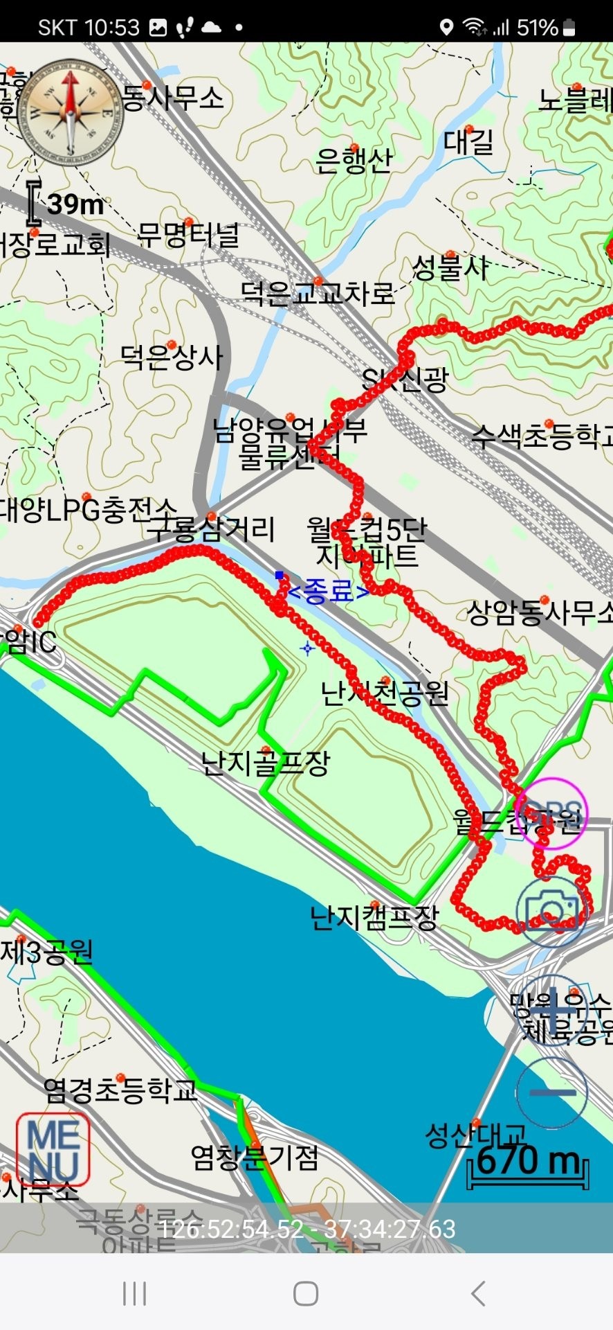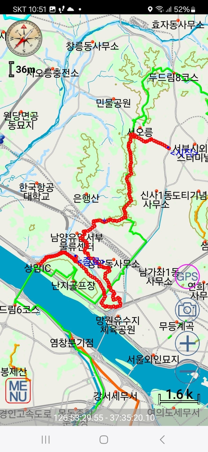반홍산으로 꺽이는 지점, 부엉이산에서 내려가는 지점, 상암산에서 내려가는지점, 매봉산에서 내려가는지점, 평화호수를 한바퀴도는 과정, 하늘공원에서 내려가는지점, 노을공원 통과하는방법