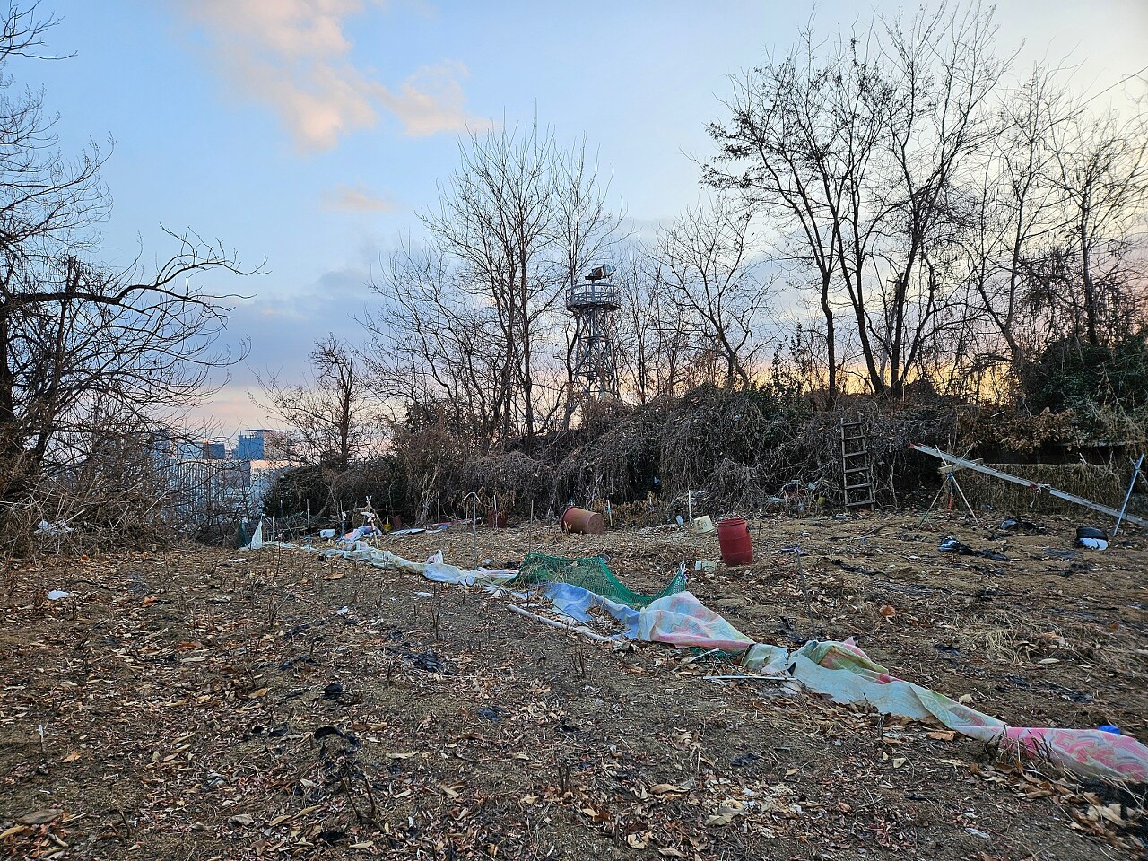 임시가건물 같은 움막에 포장이 쳐져있어