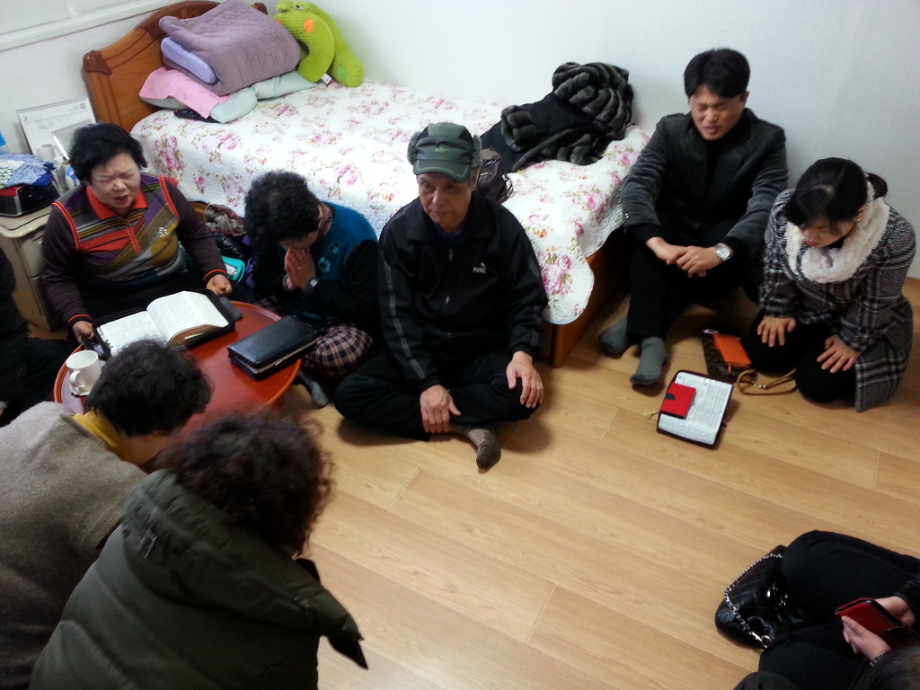 가정에 온 성도들과 함께 축복의 기도를 뜨겁게 인도하시는 목사님. 성령의 불길이 활활~