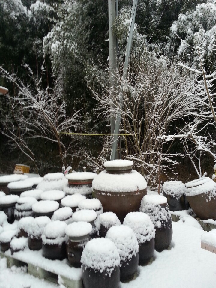 눈 맞은 항아리들이 눈사람 같네요