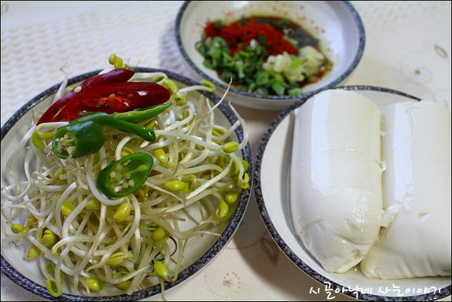 [콩나물 순두부찌개 재료] 콩나물1줌100g, 순두부1봉지, 물350ml, 청양고추1개