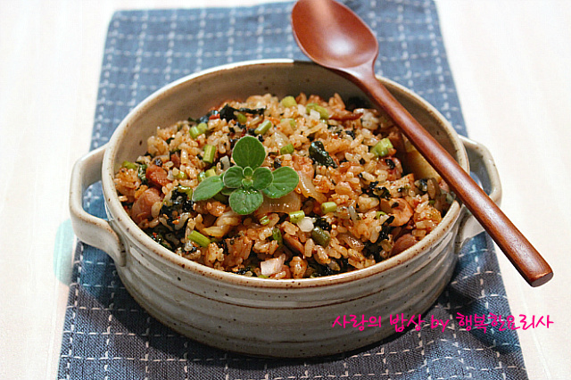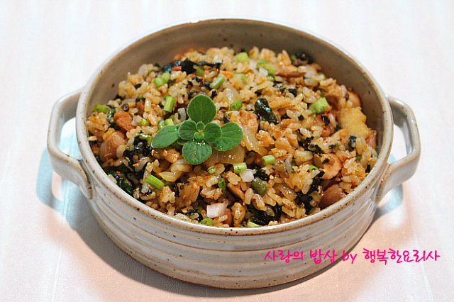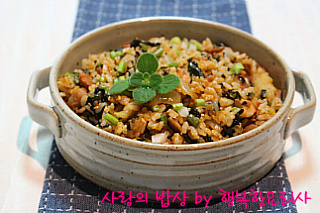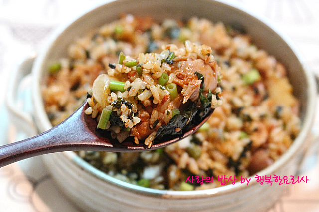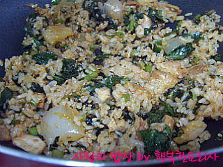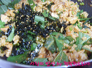 밥을 넣어 볶다가 깻잎,김가루를 넣어 볶는다.