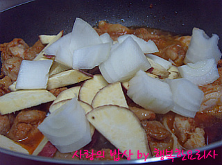 3. 2에 먹기좋게 썰은 고구마와 양파를 넣고 볶다가