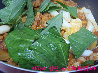 센불에서 양배추,풋고추,깻잎을 넣어 볶는다.