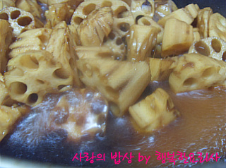 5. 냄비에 연근을 넣고 조림양념을 부어