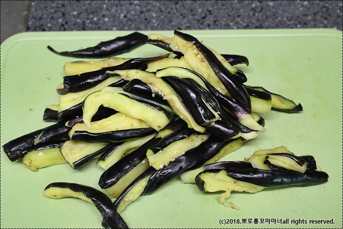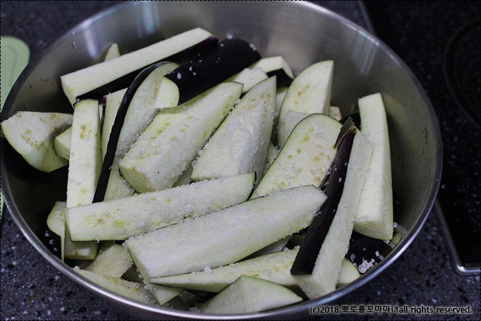 가지를 한번 절여서 그냥 가지 찌거나 볶은것보다 훨씬 덜 물컹거리고~