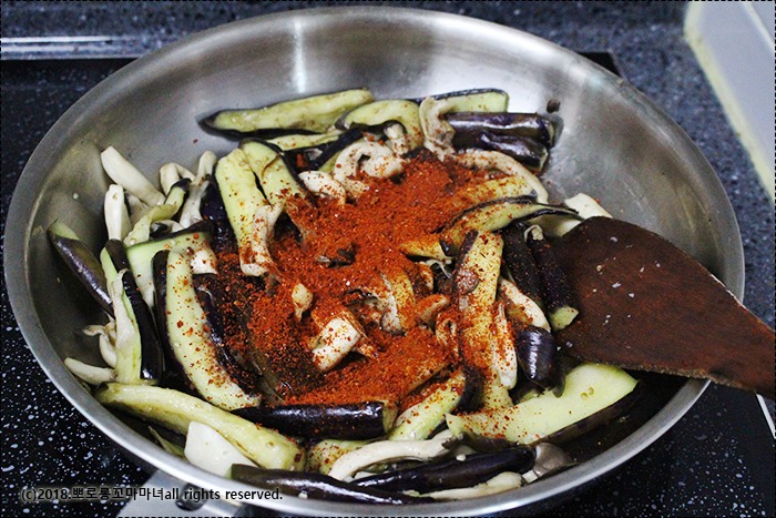 중불로 줄여서 가지와 버섯이 익을 정도로 볶아주세요.
