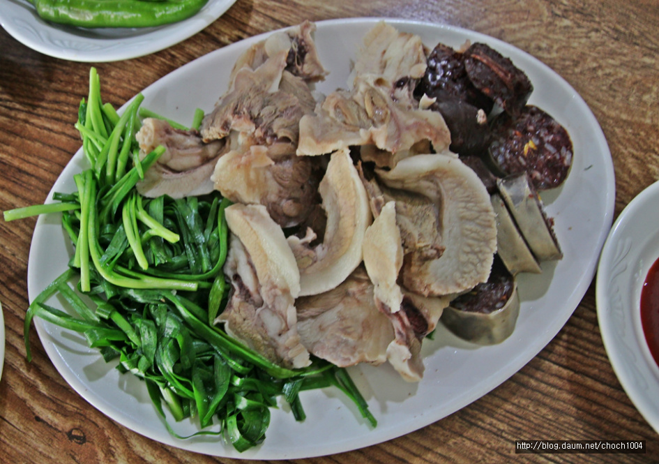 접시에 부추를 정갈하게 올리고 돼지머리고기와 순대를 둘이서 먹을 만큼 적당히 담아냈다.
