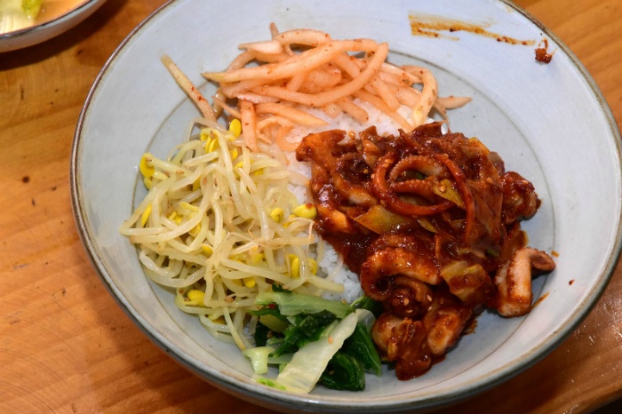 쭈꾸미볶음은 조금 매운것 같은데 야채와 밥 위에 적당한 양을 넣고 비비면