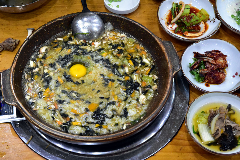 각종 야채와 버섯들이 오래 끓여서인지 노란 색으로 진한 국물이 되는데 거기에다 밥과 계란까지