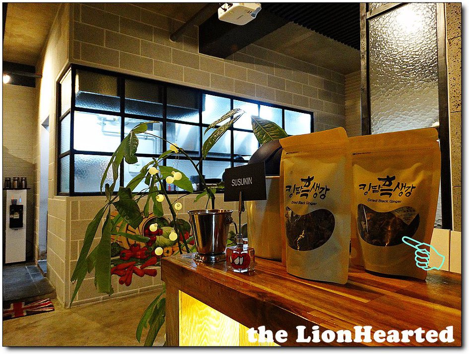 테이블에 앉으면 두 가지 스텐물통이 올라 온다, 하나는 생수, 다른 것은 엽차같이 생겼는데 맛이 이상하다, 웬만하면 몸에 좋은 것으로 사용했을 것으로 믿고 다시 한 번 마셔 봤는데 입에 전혀 맞지가 않았다, 그래서 친절한 여직원에게 물으니 아래 사진에 보이는 "킹담 흑생강'을 우려 낸 차라고 한다, 따로 판매도 하고 있다,