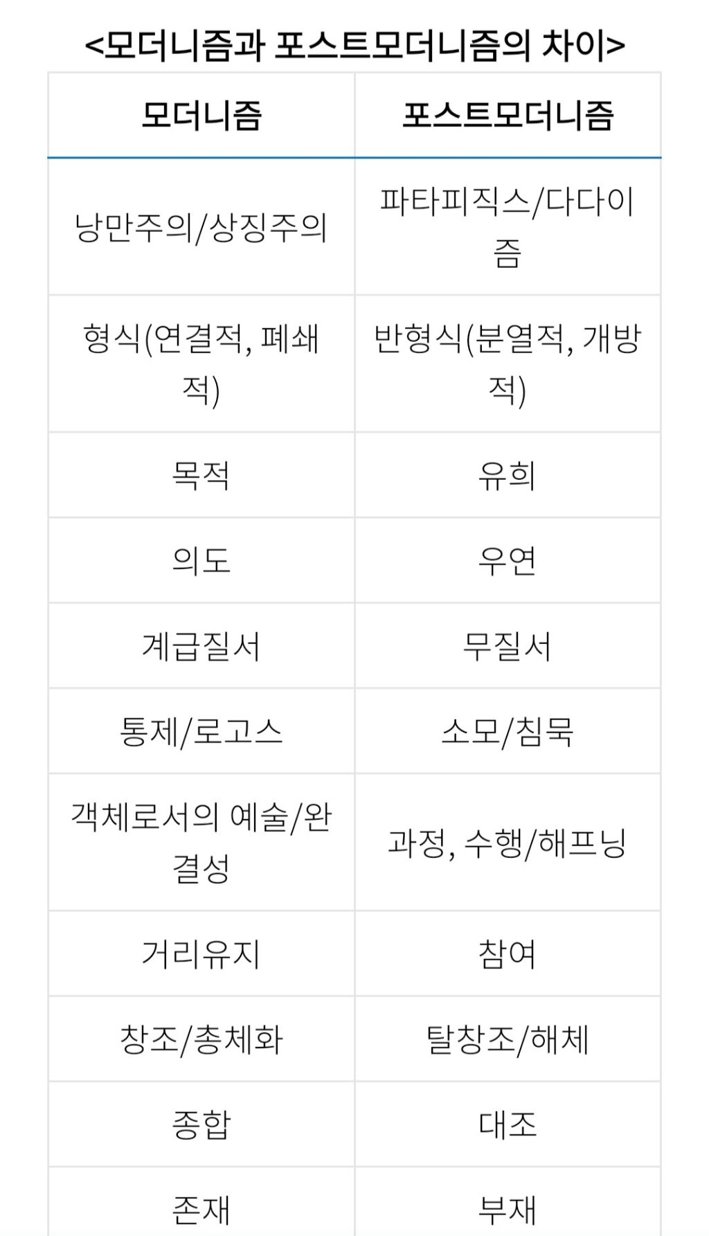 포스트모더니즘은 모더니즘에 대해 변증법적이거나 상반적인, 심지어는 적대적인 관계를 내포하고 있으므로 대립 관계를 이해하기 위해서는 모더니즘이 무엇 이었는지 정확하게 이해해야 합니다. 근대성이라고 부르는 사상적 모더니티가 시작된 것은 18세기에 계몽주의가 태동한 이후부터인데 자본주의의 기술 합리성, 기술적 낙관주의를 바탕으로 19세기까지 존속되어 옵니다. 하지만 모더니티의 사상적 논리는 예술의 영역, 모더니즘을 통해 회의와 비판에 부딪히게 됩니다. 즉 19세기 말과 20세기 초반 서구 사회는 사회․경제적 측면에 있어서 ‘초기 자본주의의 모순’이 극단적인 모습으로 표출되었습니다. 따라서 모더니즘은 사회․경제적 모더니티 에 대한 거부, 비판과 함께 시작하여 사상적 모더니티에 대한 거부와 비판으로 이어지는 움직임이었습니다. 그러나 그럼에도 불구하고 모더니즘은 모더니티의 근간이 되는 반성(이성)적 주체와 역사적 전망에 대한 희망을 포기하지 않는 미적 양식을 갖게 되었습니다. 포스트모더니즘은 이러한 모더니즘의 반성적 주체와 전망적 세계 인식에 대한 거부라고 간단히 요약할 수 있습니다. 이합 핫산(1990)은 모더니즘과 포스트모더니즘의 차이점을 구별하기 위한 도식을 그리기도 했는데, 모더니즘과 포스트모더니즘에 대한 이해를 돕기 위해 제시해보면 다음과 같습니다.