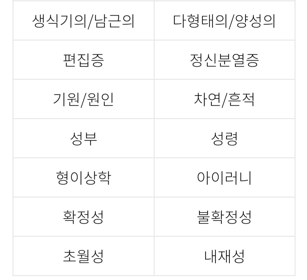 ※ 출처: 이합 핫산, 「포스트모더니즘의 개념 정립을 위하여」, 『포스트모더니즘의 이해』, 문학과 지성사, 1990, p.69~70.