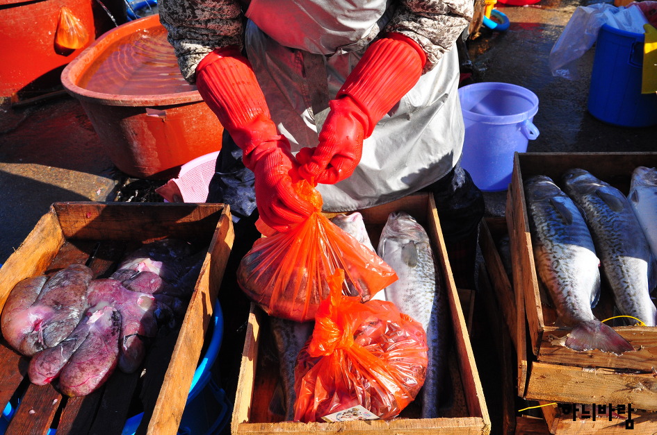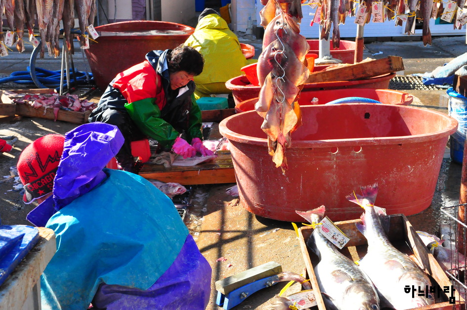 대구를 다듬어 달라는 사람들이 많아 한 쪽에 아주머니들이 앉아서 대구를 열심히 다듬고 있다.