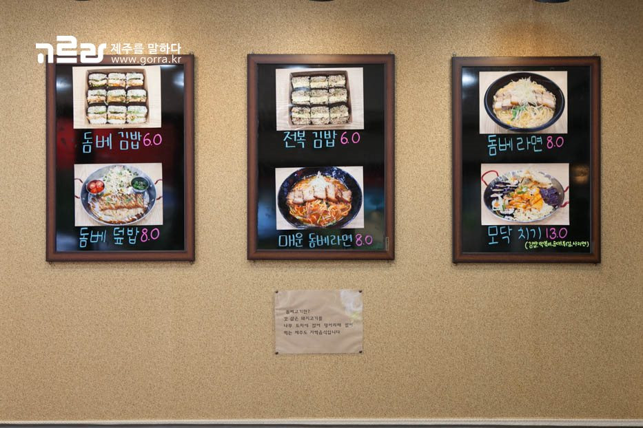 돔베 김밥, 돔베 덮밥, 전복 김밥, 돔베 라면, 매운 돔베라면 등의 제주스러운 이름의 요리들이 준비되어 있답니다^^