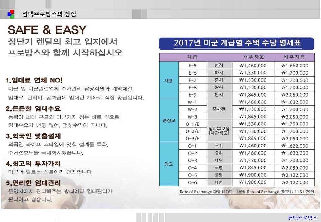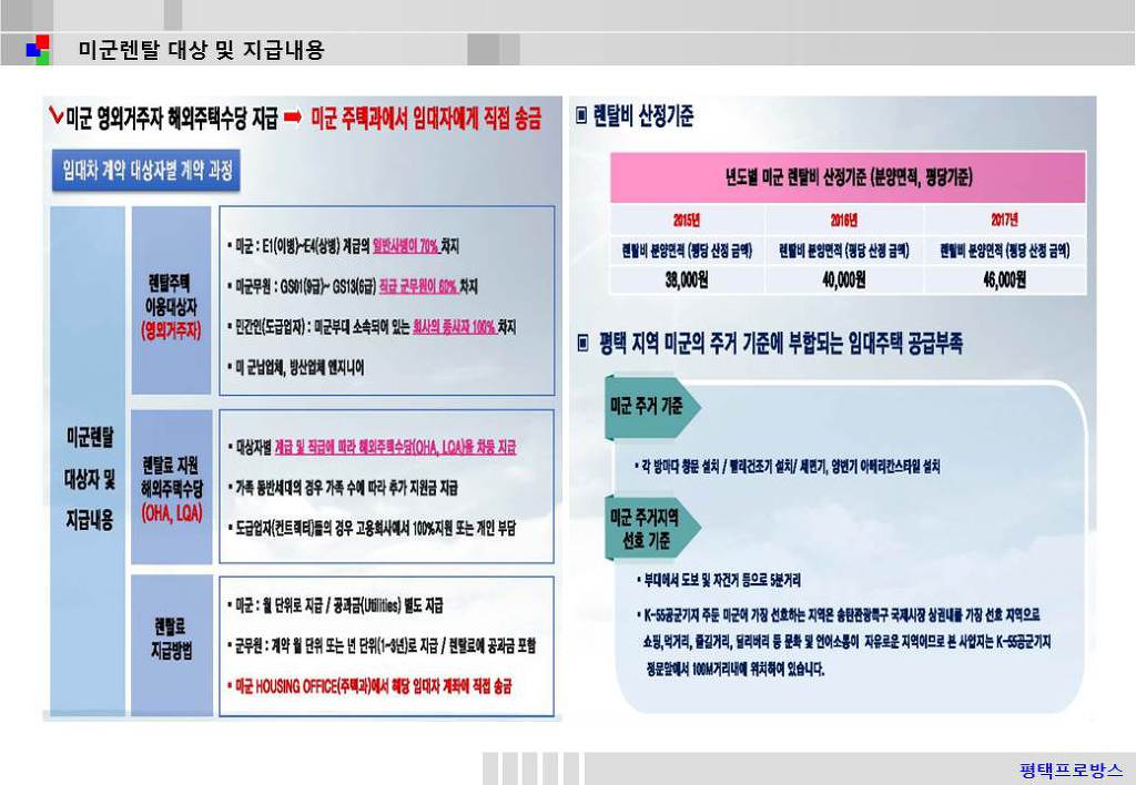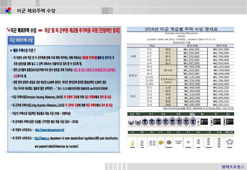 미군 및 미군무원 계급별 주거비용 지원 (안정적인 임대)