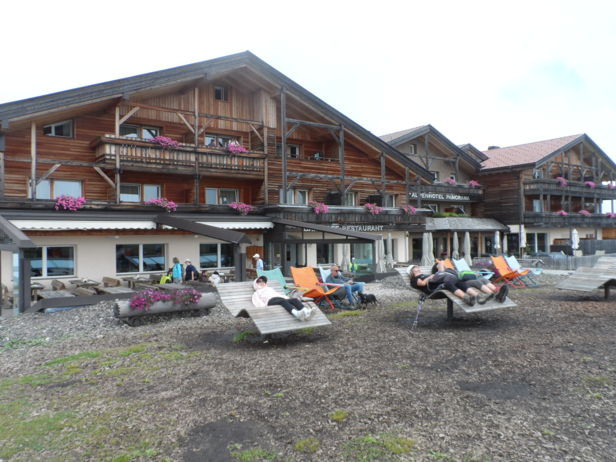 알팬 파노라마 호텔에 도착하였다 호텔 앞에는 선텐을 위한 간이 의자가 놓여 있는데