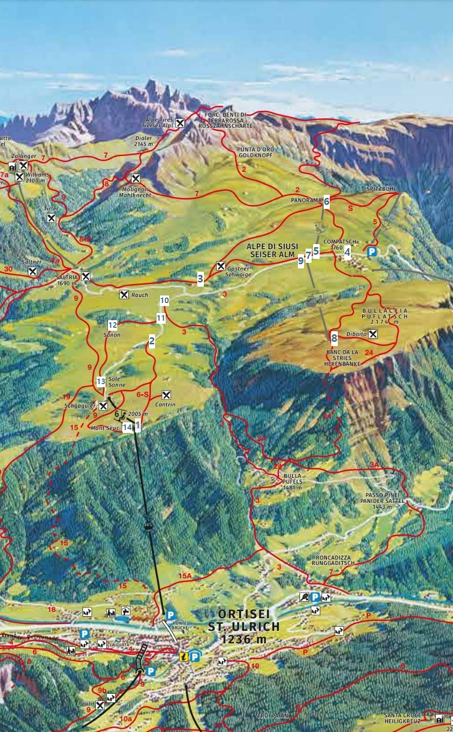 최고봉인 마르몰라다 봉우리도 보이며 서쪽에는 슐레른(Schlern)산이 초원을 둥글게 감싸고
