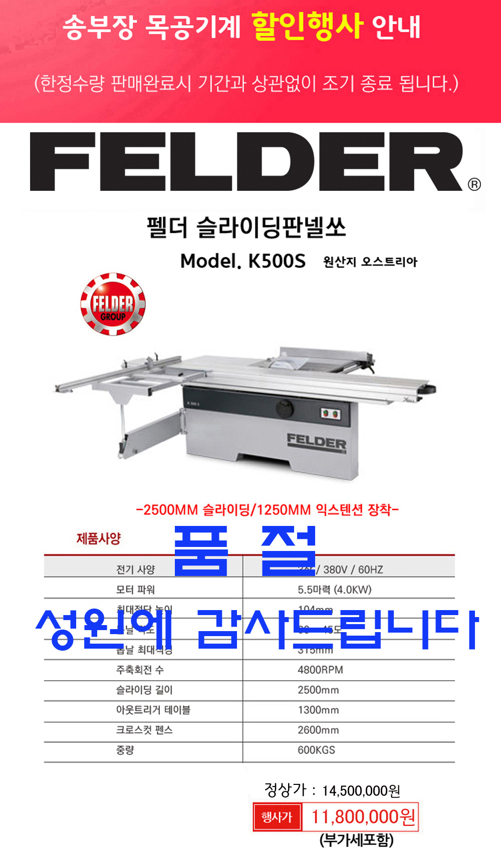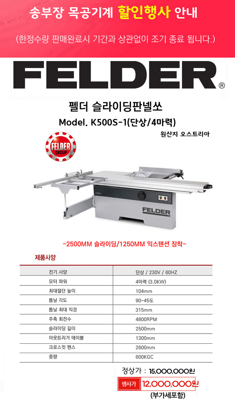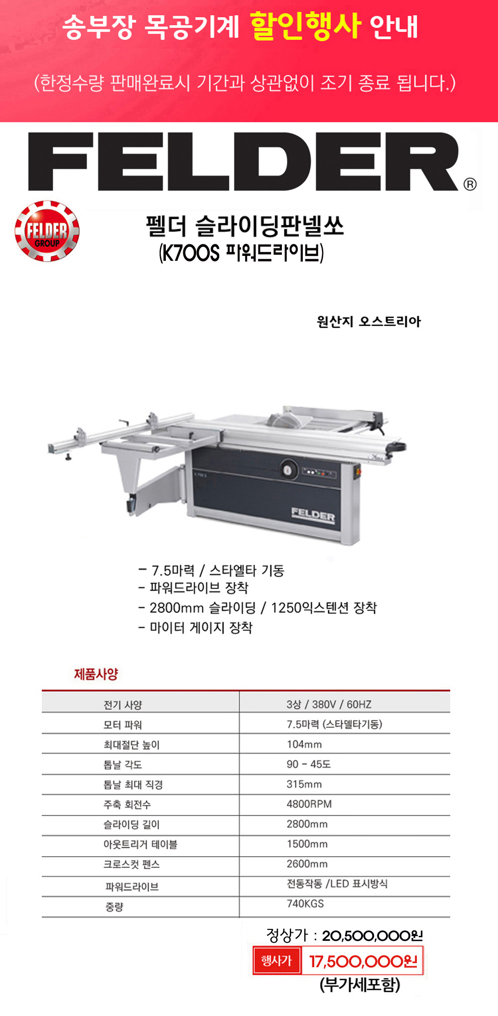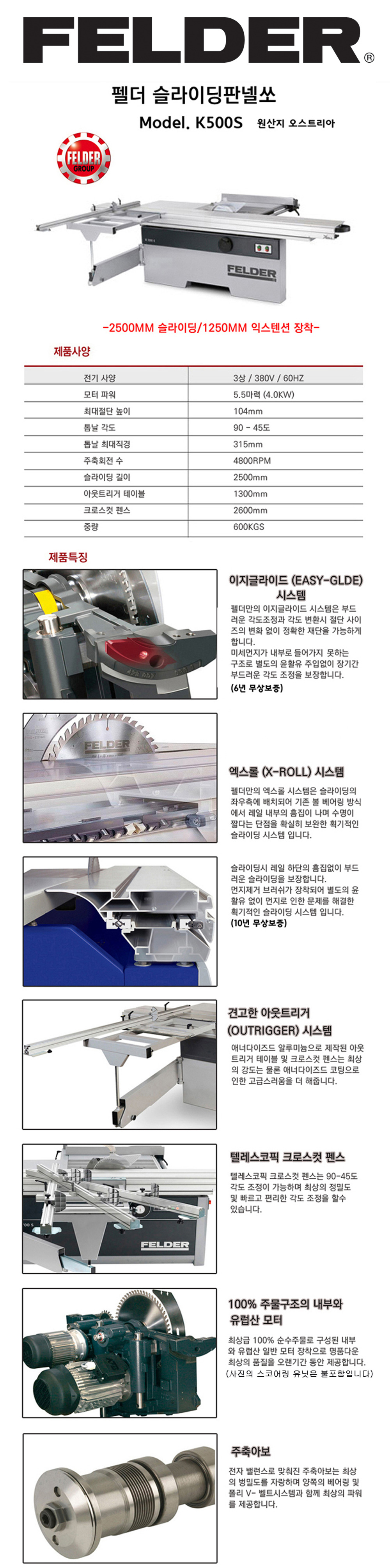 펠더 슬라이딩 판넬쏘 K500S (삼상/5.5마력) : 2조한정 (배송상품) : 품절