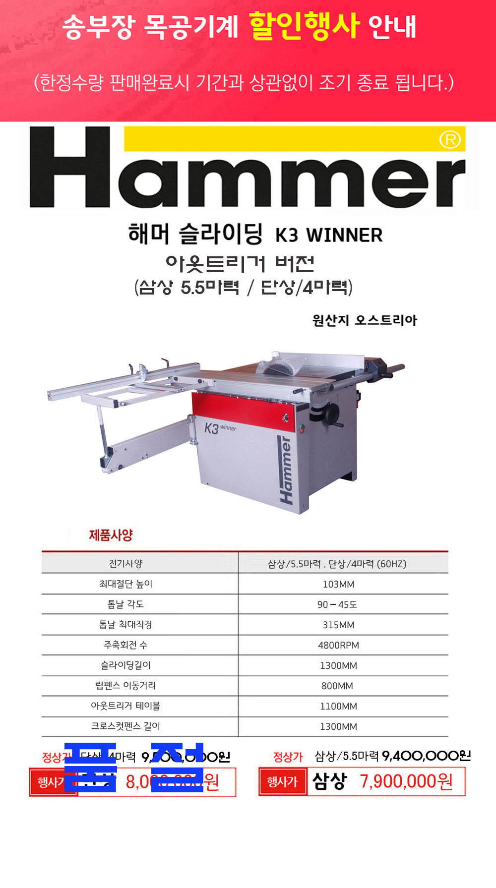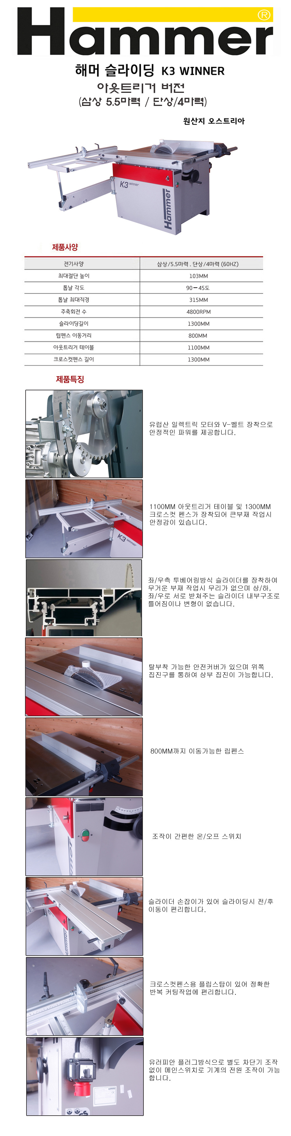 해머 슬라이딩쏘 K3 WINNER 아웃트리거형 : 삼상, 단상 각 2조한정 (배송상품) : 단상 품절