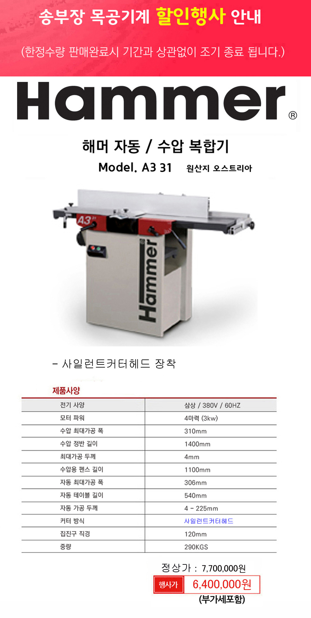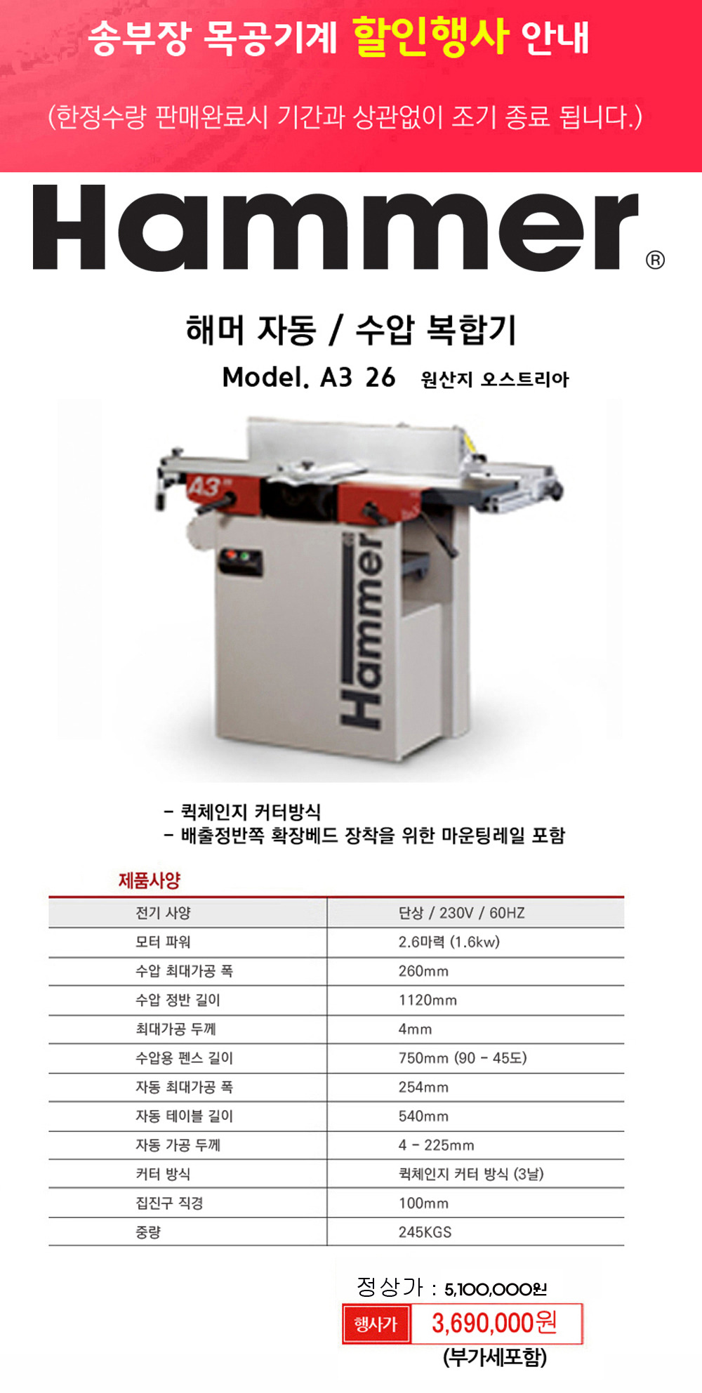 작성자우디 작성자 본인 여부 작성자 작성시간 26.01.29 해머 슬라이딩쏘 K3 WINNER 단상/4마력 모델과 410MM 사일런트커터 자동/수압 복합기 A341 모델은 행사수량 모두 완판 되었습니다.