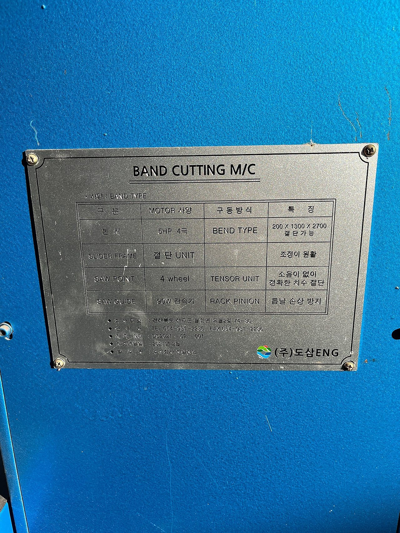 이 기계는 (주)도삼ENG에서 제작한 **밴드 커팅기 (BAND CUTTING M/C)**입니다.