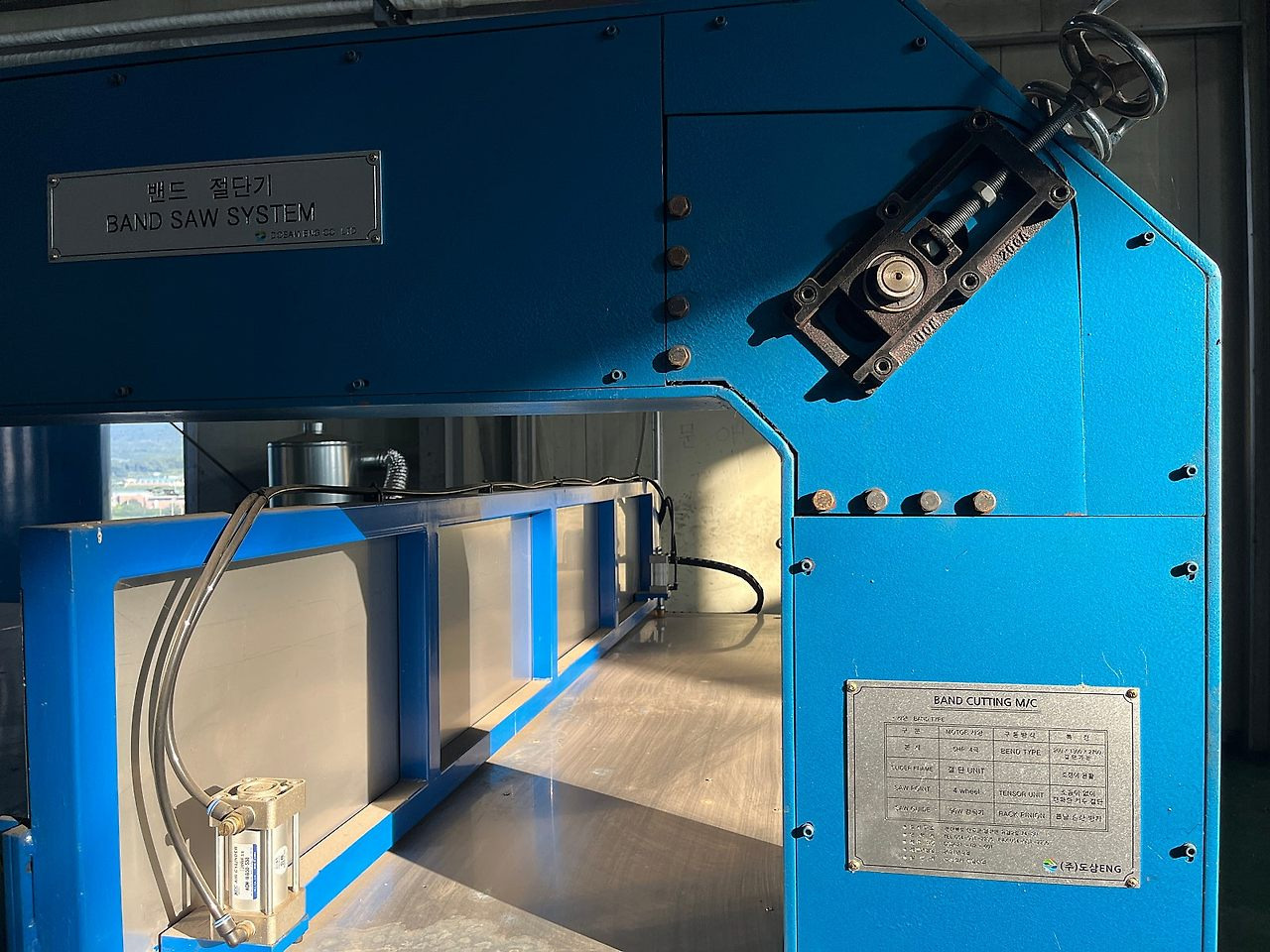 명판에 명시된 대로 이 장비는 **밴드 커팅기(BAND CUTTING M/C)**이며, 긴 **밴드 톱날(band saw blade)**을 사용하여 재료를 절단하는 방식입니다.