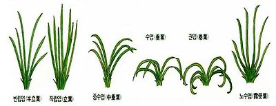 - 중입엽(中立葉):잎 전체 길이의 5분의 4 정도는 서있지만 나머지 5분의 1이 완만한 곡선을 그리는 모양이다.