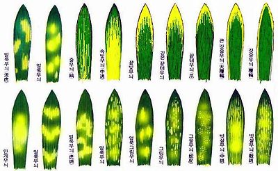 선반(先斑) : 산반이 잎 끝에만 집중적으로 나타나는 상태를 가리킨다.