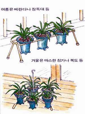 오전에는 햇빛이 충분히 들고 통풍이 잘 되는 곳에 둔다. 온도는 최고20도 ,최저10도내외로 조절하고 30도를 넘지않도록 세심한 관리가 필요하다. 오전중에는 햇빛을 충분히 쪼이고, 오후에는 차광해 준다. 3월 초봄에는 물주는 횟수를 늘리고 늦봄부터는 해가 진후에 물을 주는것이 좋다. 비료는 월 2~3회 농도를 연하게 하여 충분히 주고 꽃망울이 핀 난에는 주지 않다가 꽃이 지고 난 후에 꽃대를 잘라 주고 충분한 안정을 취한 다음에 영양제나 활력제를 주어 생육을 촉진시킨다. | |