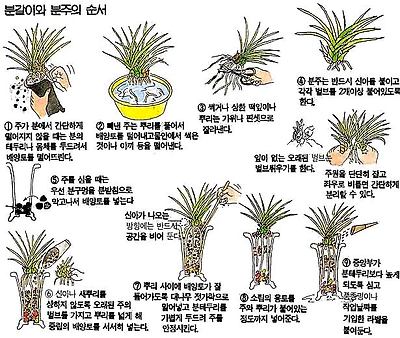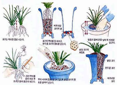 ▶ 분갈이 : 늦어도 4월 10일 까지는 분갈이를 끝내야 한다. 화장토만 갈아 주는 약식분갈이는 매년해도 좋지만 정식분갈이는 2-3년에 한번씩, 생육상태가 좋지 못한 분, 전시회에 다녀 온 난도 즉시 분갈이를 한다. 분갈이를 할 때에는 썩은 뿌리는 소독된 가위로 잘라내고 건강한 뿌리는 상처가 나지 않도록 하며 포기나누기를 할 떼에는 신아가 다치지 않도록, 또 새촉이 어디에서 나올까 세세히 살펴서 분갈이를 한다 분갈이 전 2-3일 전 부터 물을 주지 않는 것이 좋으며 분갈이를 마친 난은 물을 흠뻑 준 다음 일주일 정도 어두운 곳에서 일반난 보다 2-3배 정도 많은 물을 주고 정양관리 한다. ▶ 비료주기 : 난의 신아가 나올 시기 이므로 규정된 농도 보다 연하게 시기를 정하여 자주 주는 것이 효과적이며 활력제 또한 효과가 높은 시기로 기온이 점차 올라 감에 따라 신아성장과 뿌리의 활착이 시작된다. |