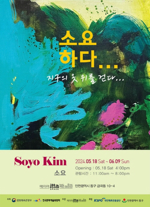 | 소요 초대展 Soyo Kim 소요하다... 지구의 옷 위를 걷다 2024. 5. 18(토) ▶ 2024. 6. 9(일) Opening 2024. 5. 18(토) 오후 4시 인천광역시 동구 금곡로11번길 1-4 "자유로운 여정: 지구를 걷다" "Free Journey: Walking the Earth" 정창이 보통의 사람들은 단순한 산책이나 여행을 경험으로 여기지만, 소요 작가는 그 이상의 의미를 지니고 있습니다. 지구의 표면을 걸으면서, 나는 우주적인 신비로움에 대한 깊은 탐구에 빠져들었습니다. 모든 경험에서 채집한 생명체가 작가의 예상치 못한 곳으로 끌어올렸고, 더 나아가서는 작품들에 영감을 주었습니다. 특히, 지구상에서의 태어남을 상징하는 옷을 캔버스에 옮겨 그려내는 과정은 작가에게 큰 즐거움을 안겨주었습니다. 그 과정에서, 작가가 어떻게 에너지를 사용하며 살아가는지, 어떻게 소통하고 표현하고자 하는지에 대한 고민이 끊임없이 작품에서 묻어나고 있습니다. ["아침의 산책, 깊은 숲속, 얼음이 언 골짜기에서," 바람이 솔솔 부는 항구, 혼자 있을 때나 소중한 사람과 함께 있을 때의 감정과 공기, 에너지를 기억하고자 합니다. 이런 순간들이 나를 더 깊은 탐구와 탐험으로 이끄는 것 같습니다. - 작가 노트 중 -] 그래서, 소요작가는 관객분들에게 본인의 긴 여정에 인천 배다리 여인숙이었던 재생공간 잇다스페이스 작은미술관으로 초대합니다. 함께하는 여정 속에서, 소요하듯이, 자유롭게 거닐며 새로운 경험과 감정을 만들어보세요. 작가노트 익숙한 공간으로 부터 멀리 떨어져 경험하게 된 여행은 상상할수 없었던 대자연의 신비로움에 깊이 빠져들게 하였고, 지속적으로 탐구하게 되는 작품소재가 되었습니다. 특히나 지구에 처음으로 탄생한 지의류를 반복적인 시험을 통해 캔버스에 옮겨놓는 작업이 즐거웠습니다. 그림 그리는 사람으로 살면서 내가 어디에 얼마나 많은 에너지를 쓰며 살고 있으며, 어떤 방법과 표현으로 소통 하고자 하는지는 늘 고민이며, 알아가는 과정에 있습니다. 아침의 산책에서, 여행 중 깊은 숲에서, 빙하의 계곡에서, 바람부는 항구에서 혼자일때나 소중한 이들과 함께 일때도 순간의 감정들과 공기와 에너지를 기억하고자 했습니다. 소요하듯... 자유롭게 이리저리 거니는 여정에 초대합니다. | ||