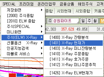 키움 영웅문 메뉴에서 'SPECIAL -> 주식(ELW) X-Ray -> [1401] X-Ray 현재가'를 누릅니다.